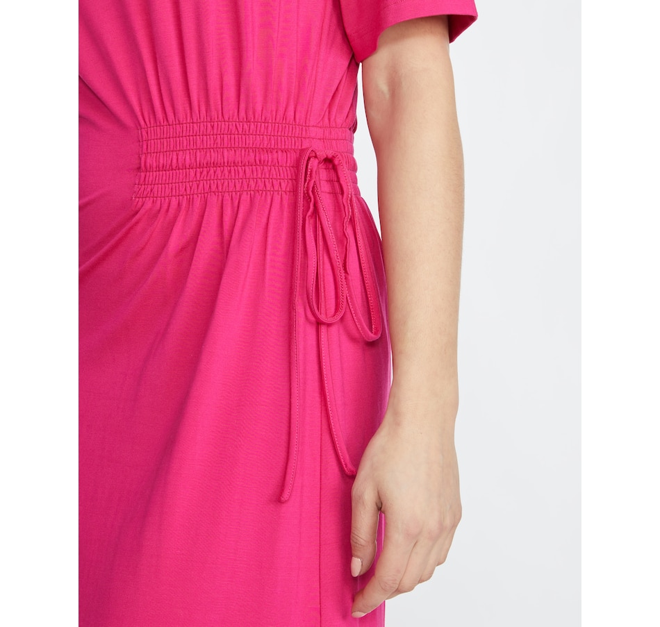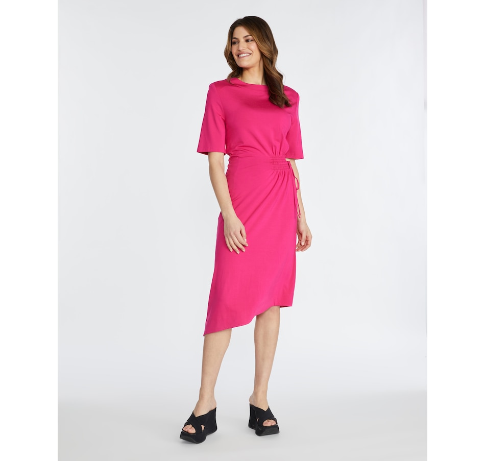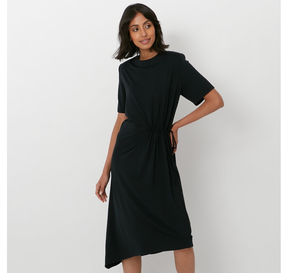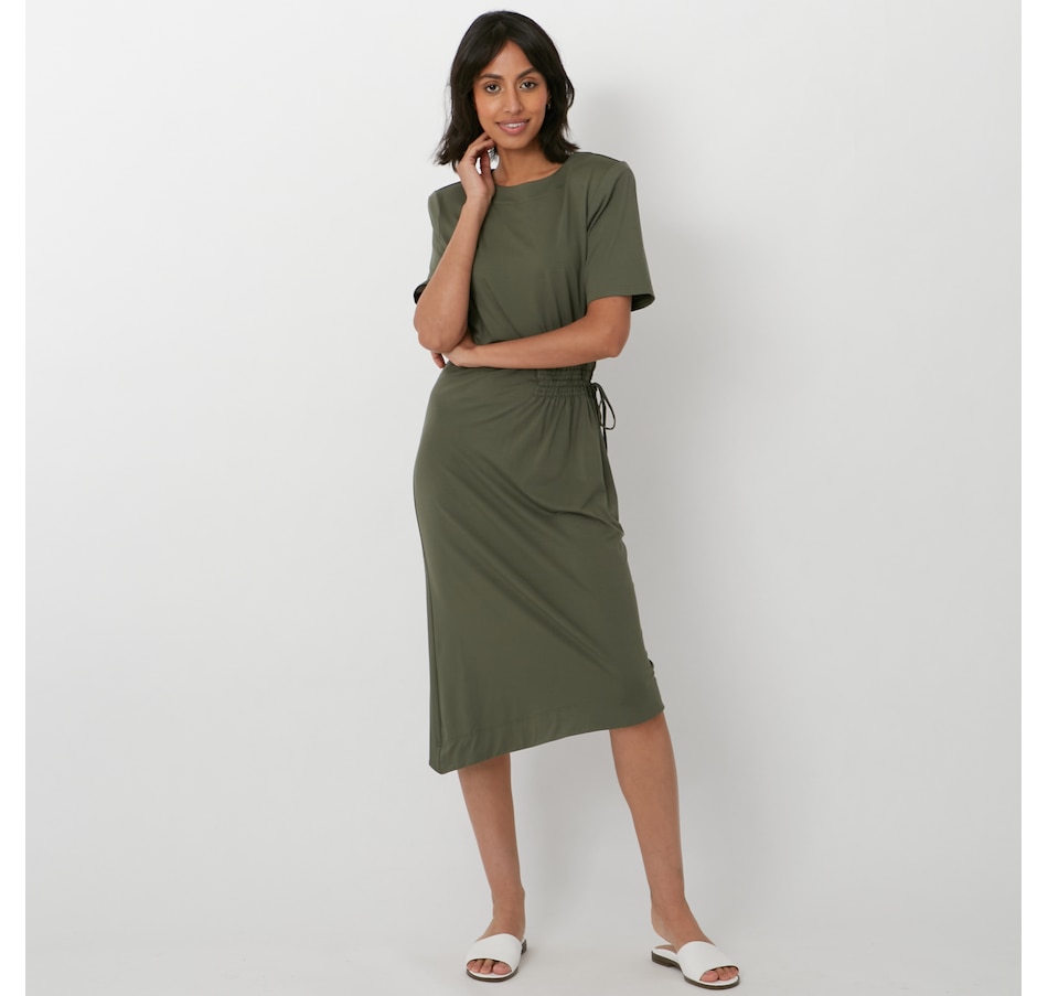 • Elastic waist detail, tunnel with flat drawstring at side, angled hemline