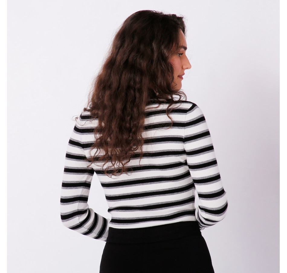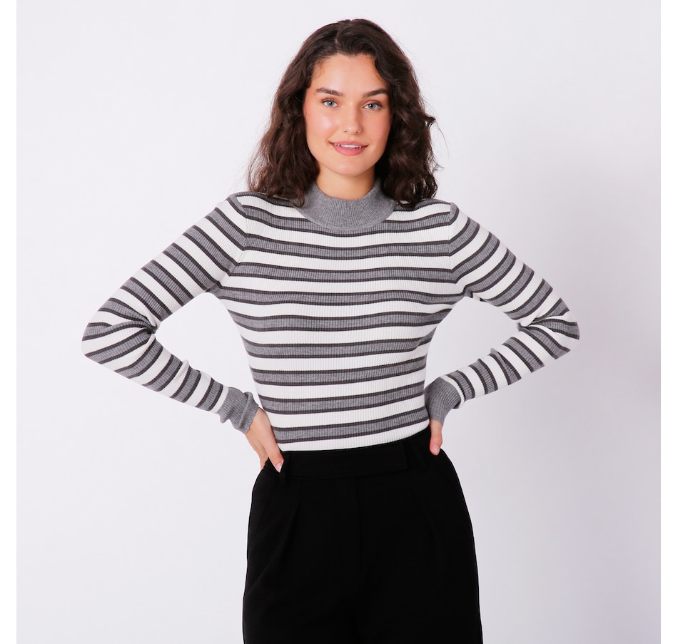 Finish your fall look in undeniable, vibrant style with this striped mock neck sweater from Badgley Mischka.