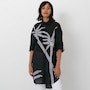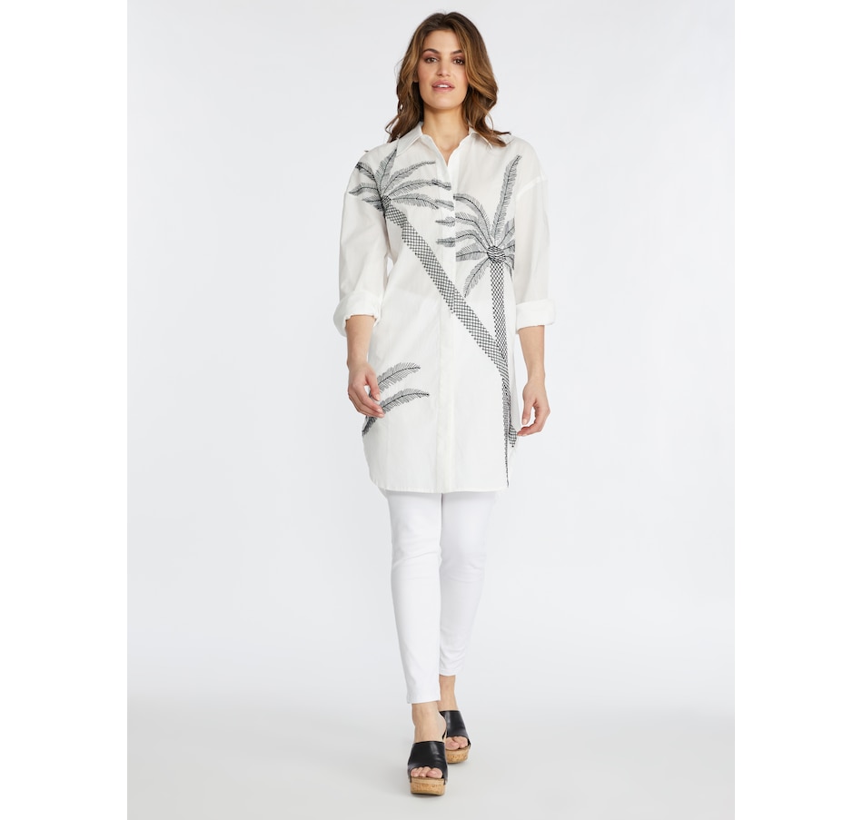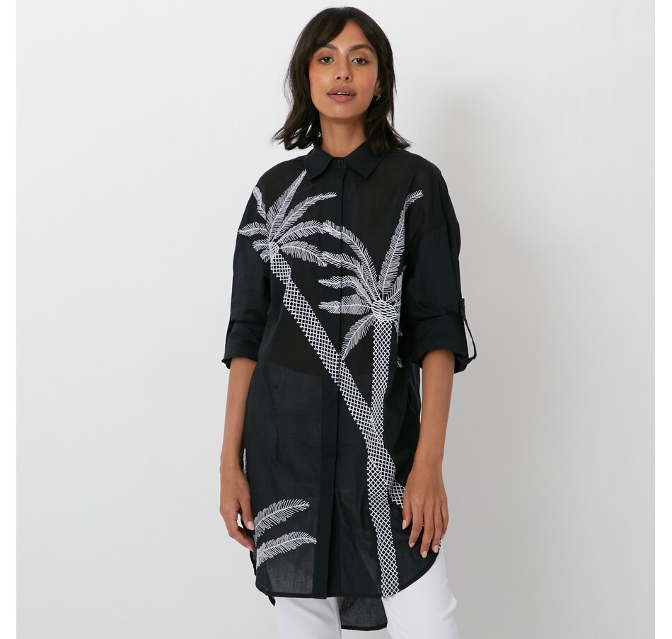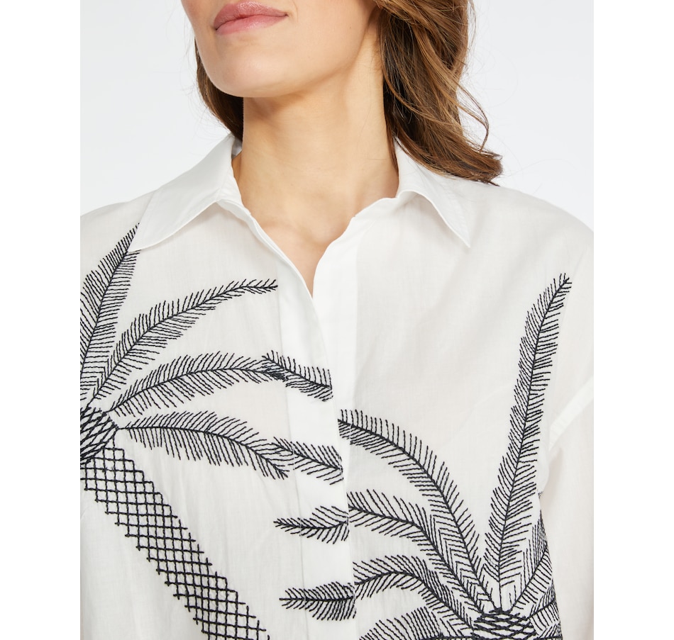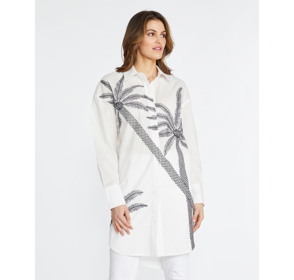 Add a touch of tropical to your look wearing this tunic shirt with hand embroidered palm trees designed by Badgley Mischka.