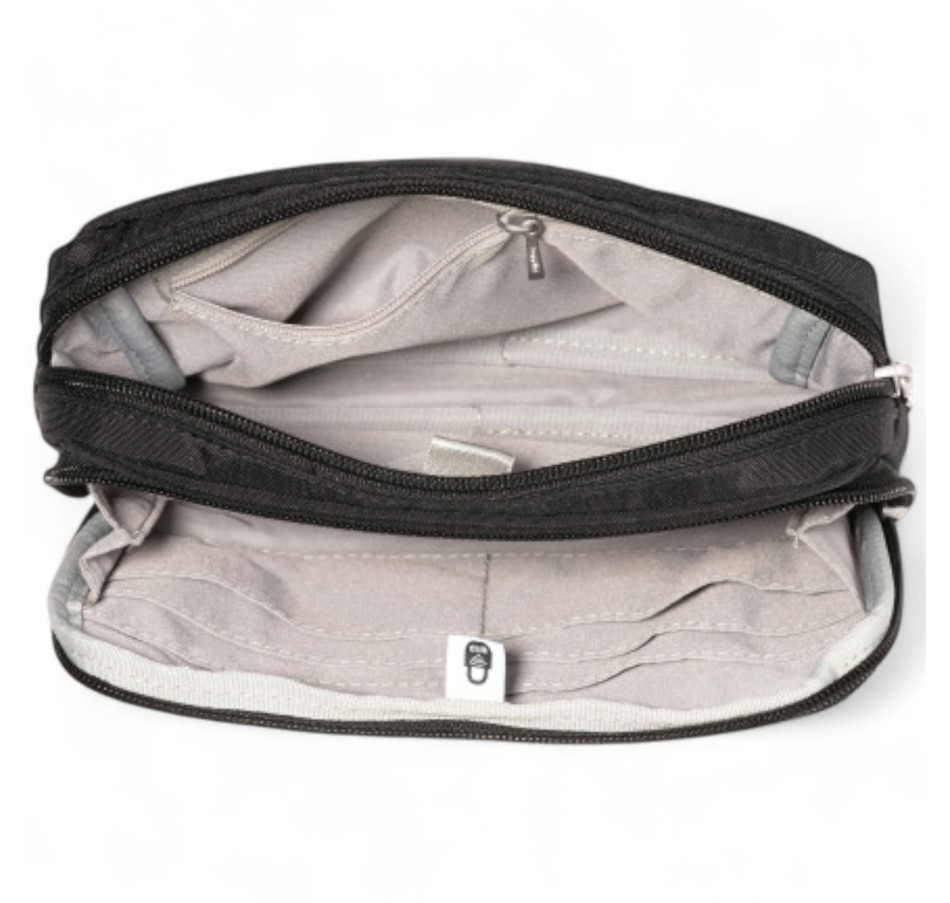• (2) zipper compartments, RFID protection with (6) credit card slots