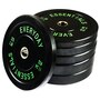 Bumper plates, or just bumpers, are Olympic-sized weight plates that are made of thick, dense rubber for the purpose of allowing a loaded bar to be safely dropped without risk of damaging your lifting platform, the plates themselves, or the floor. These high-density rubber plates with solid stainless-steel insert can withstand repeated drops. They will not only protect any type of floors, but also protect your bars. Their weight is labeled in both pounds and kilograms. They're the perfect weights for all types of resistance training including weightlifting, powerlifting, and CrossFit.