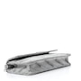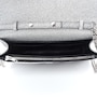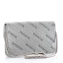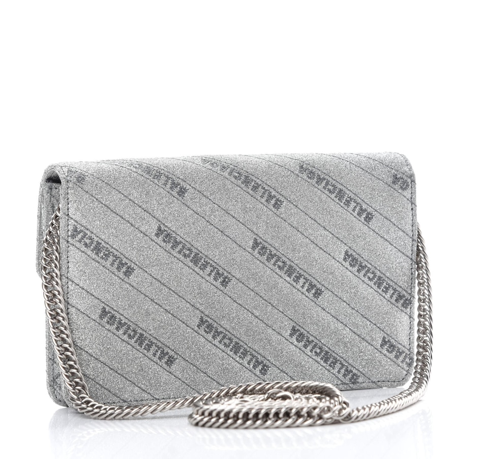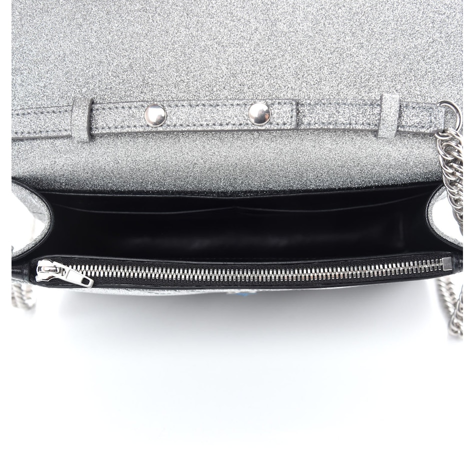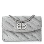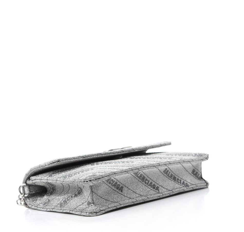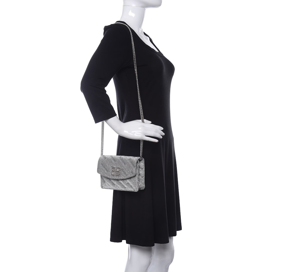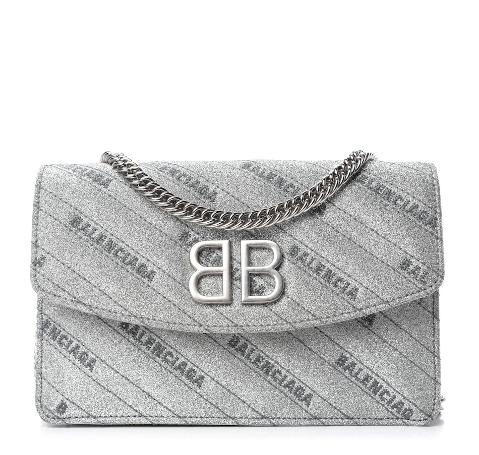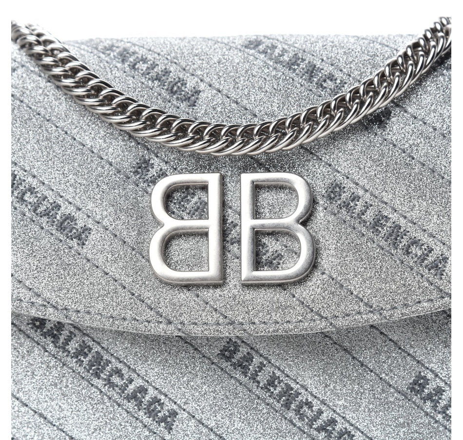 This chic silver shoulder bag is crafted of silver glittery leather with a Balenciaga BB logo on the front flap, and removable silver chain link and leather strap. The flap opens to a black leather interior with card slots.