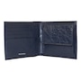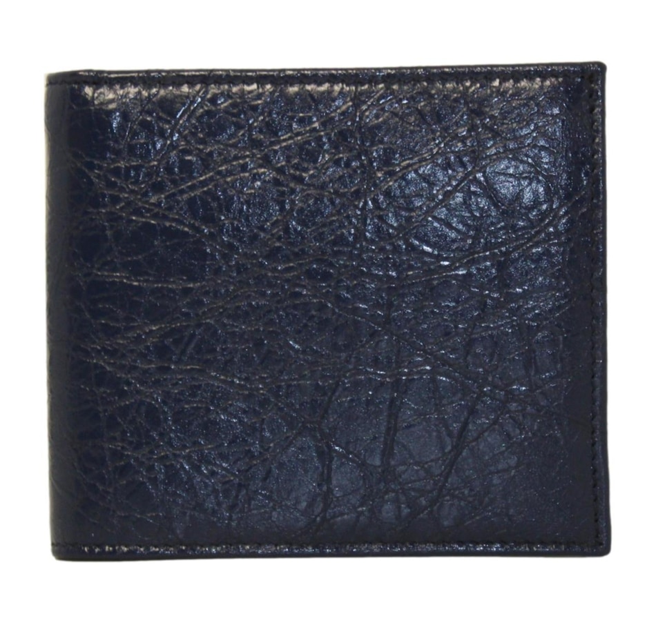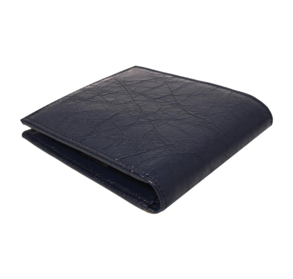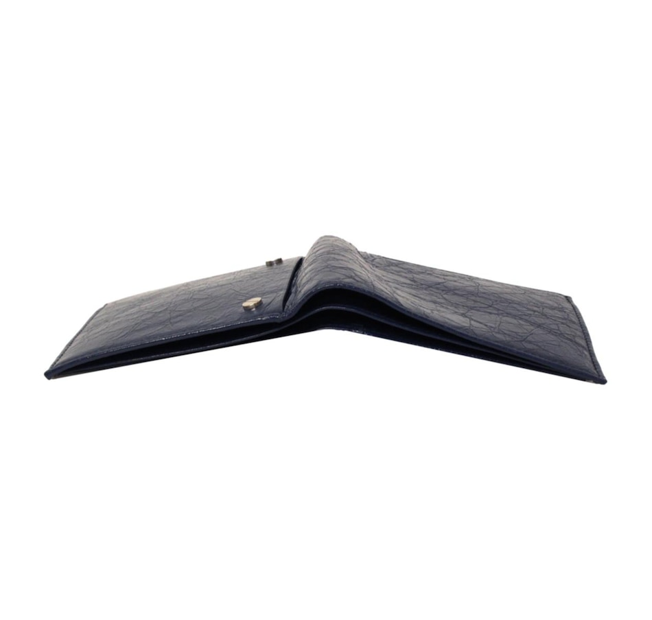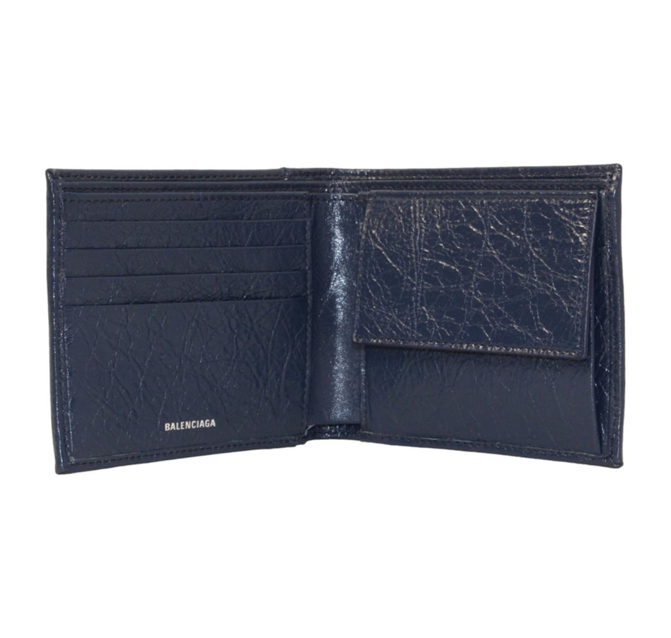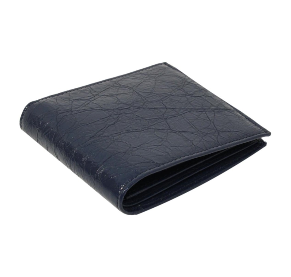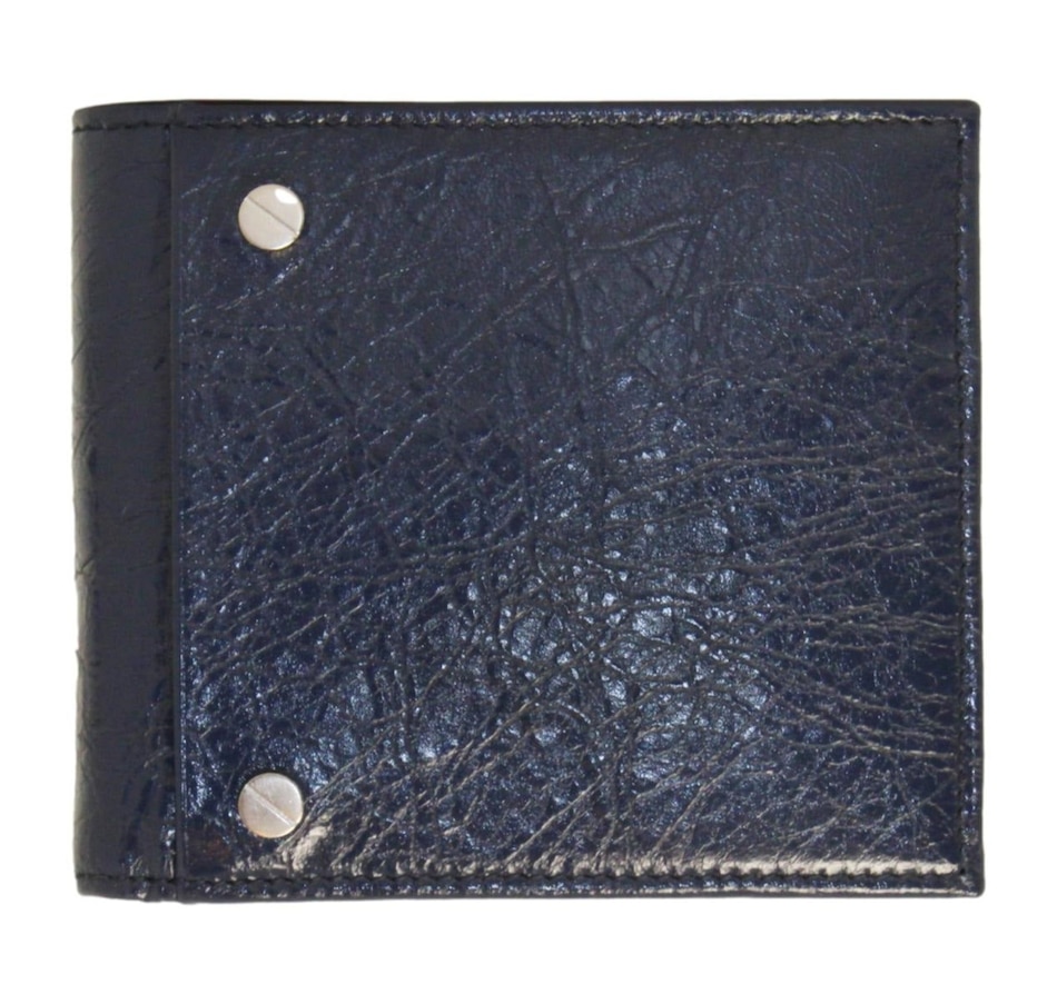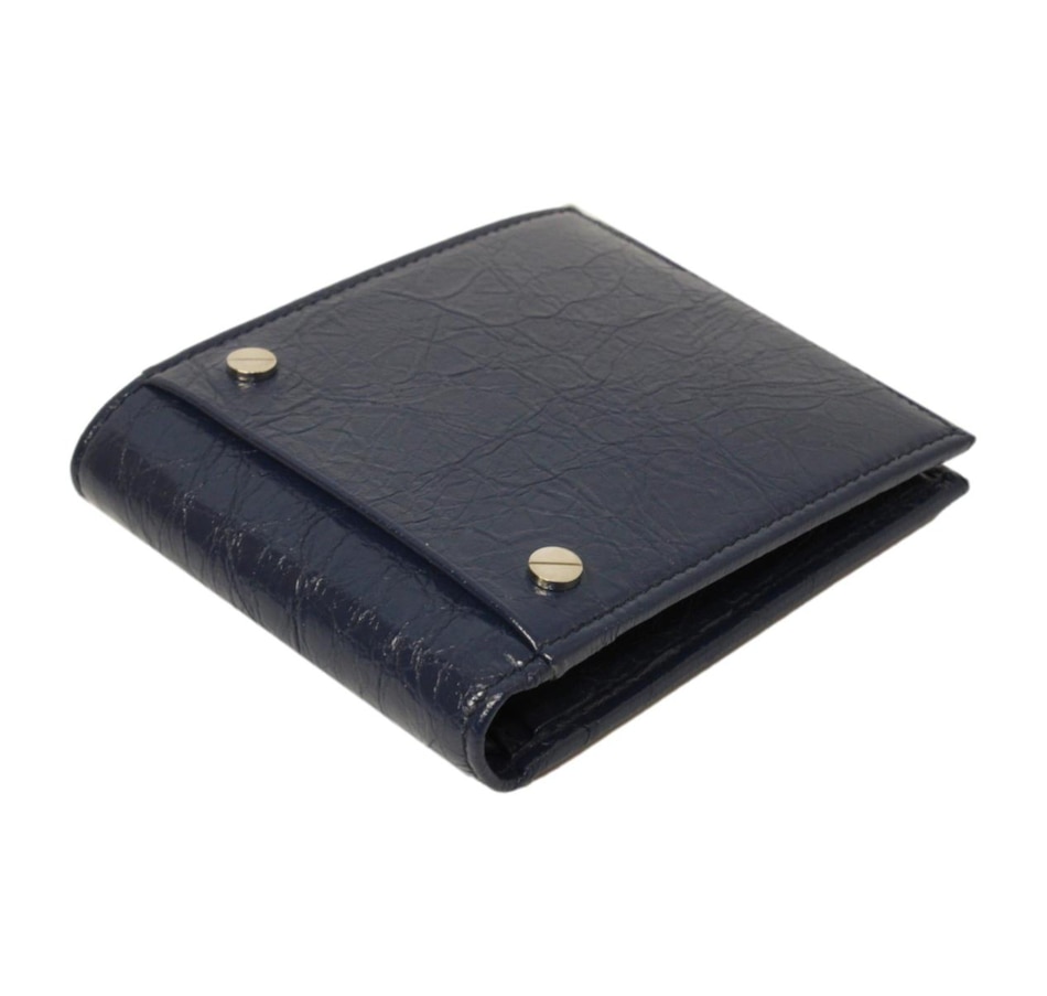 This bifold wallet is crafted of a shiny crinkled blue leather with two silver-tone stud details on the front face. The interior is made with the same blue calfskin leather and features card slots, bill slots, and a coin compartment. The clean design and functionality of this wallet make it perfect for everyday use!