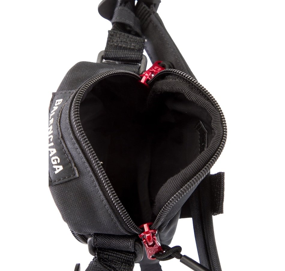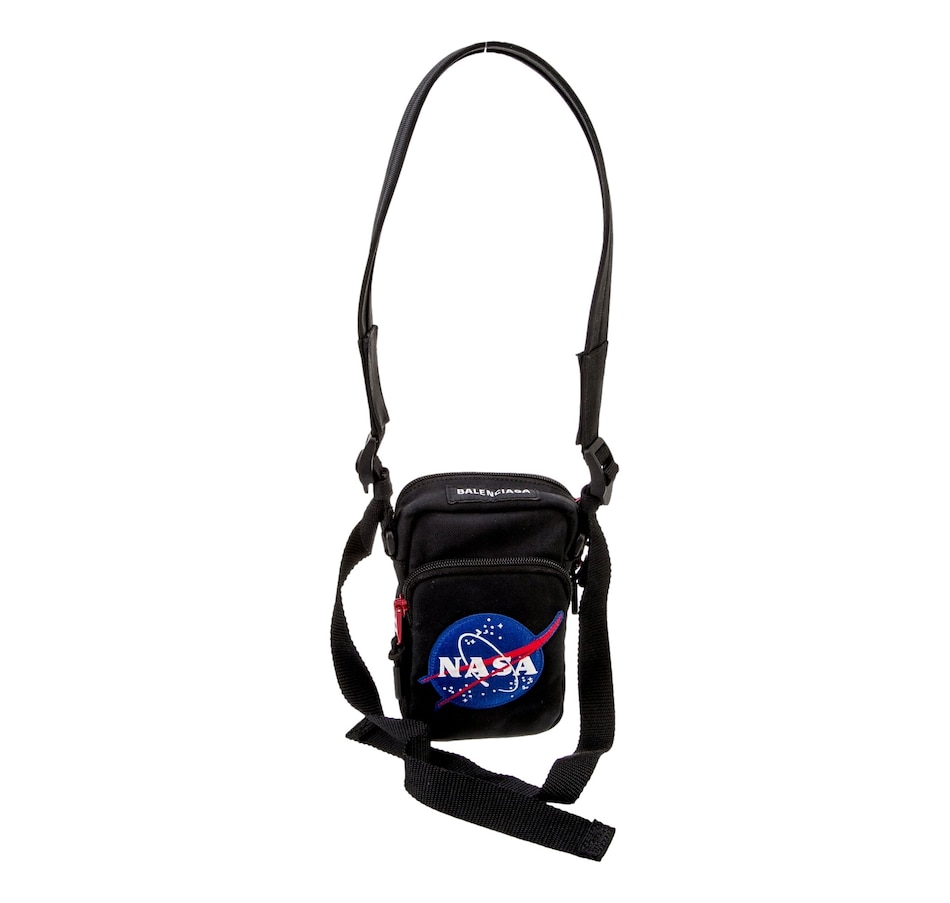 Introducing the Balenciaga NASA Logo Phone Holder Crossbody Bag. This chic accessory features a bold red NASA logo on pristine black recycled nylon. Conveniently designed with a front zip pocket, it offers easy access to your essentials. The single flat adjustable canvas shoulder strap ensures comfortable wear. Opening with a two-way zip closure, this bag provides effortless access to your belongings. Inside, fine textile lining adds durability and a touch of luxury. Finished with red tone hardware, this crossbody bag exudes sophistication and modernity. Elevate your everyday look with the Balenciaga NASA Logo Phone Holder Crossbody Bag, a stylish companion for any adventure.