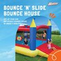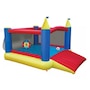 Bounce, slide, kick, throw, and play with the Banzai Slide n' Score activity bouncer! This inflatable bounce house helps to keep kids entertained and active all summer long with built-in games and a large jumping surface. Little ones can jump and tumble in the roomy bouncing area, kick or toss the soccer ball into the goal, or practice their aim with the dart board and target balls outside the walls. Kids can invent their own games with all the included toys. With a wide slide for entry and exit, this outdoor bouncer bounce house is great for ages three and up. Parents will love how easy the outdoor playset bounce house is to set up; it features a built-in pump that can inflate the activity bouncer in under two minutes. The Banzai Slide n' Score activity bouncer is great for outdoor or indoor play in large spaces.