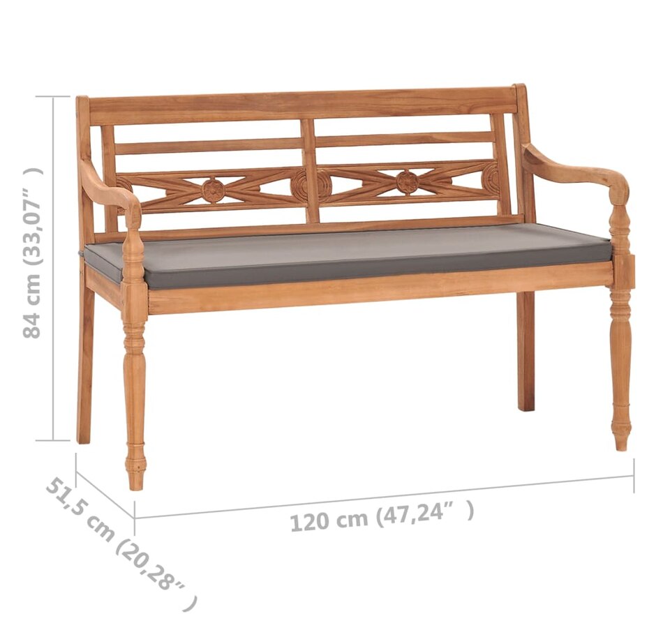 This wooden Batavia bench will give a simply stunning appearance to your garden or patio. Made from extremely durable teak hardwood, this piece of teak furniture has been seasoned, kiln dried and then finely sanded to give it a very smooth appearance . Teak wood is known for its exceptional weather resistance, making it far more suitable for garden furniture than any other type of wood. Teak wood is the ideal choice if you want to buy durable garden furniture. Thanks to its finely sanded surface, the garden bench is weather-resistant and adds a touch of rustic charm to your garden. It is very suitable for relaxing or dining with friends or family.Note: In order to extend the life of your outdoor furniture, we recommend cleaning it regularly and not leaving it outdoors. unprotected exterior unnecessarily.Cleaning: Use a mild soap solution.Storage: If possible, store in a cool, dry place indoors. If the product is stored outdoors, protect it with a waterproof cover. Wipe and dry excess water or snow from flat surfaces after rain or snowfall. Allow sufficient air circulation to avoid moisture damage.