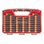 Battery Daddy is a storage device to help organize all your batteries! No more digging through junk drawers! It's double-sided and holds 180 batteries: 78 AAs, 64 AAAs, (8) 9 Volt, 10 Cs, 8 Ds, 12 button cells. It has a clear cover that lets you see all your batteries at once. The sturdy carry handle lets you take the batteries anywhere. Sleek and compact, the Battery Daddy fits perfectly inside drawers with the added security with heavy duty latches. Battery tester included!