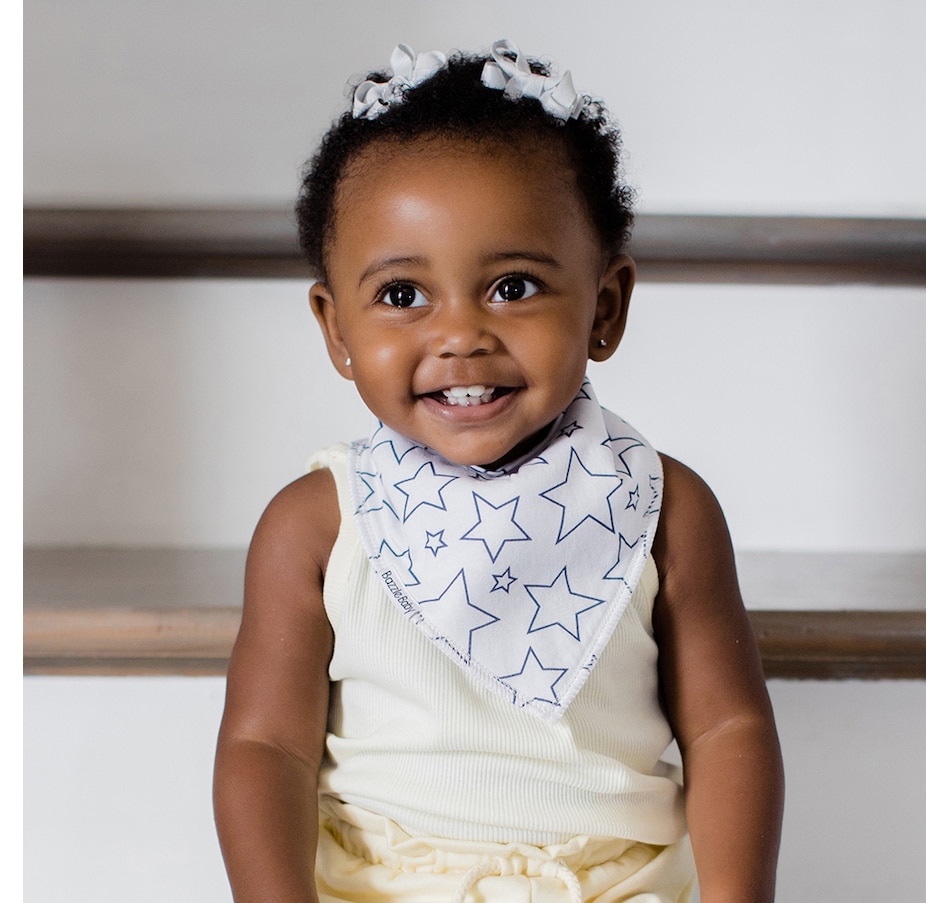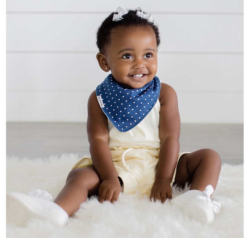 Your baby will be dry and happy with the Bazzle Baby Harper Bandana Bib! This classic bandana drool bib, made from a 100 percent organic cotton front and a 100 percent polyester fleece back, will soak up drool, spit-up, food and more. The soft cotton front soaks up every drop of drool, while the fuzzy polyester fleece backing won't let it soak through to get on baby's clothing or sensitive skin. Adjustable snap closures allow the bib to grow along with your baby, and the secure fit helps prevent sliding or pulling off when clipped in place, plus it fits under your baby’s chin to protect clothing collars. It’s a great way to save on outfit changes and doing loads and loads of laundry! Bazzle Baby's lines are designed with adorable patterns and use quality material for comfortably cute baby essentials. Mix and match any of their bibs with stylish colours and fabrics to bring a little fun to your little one's fashion!