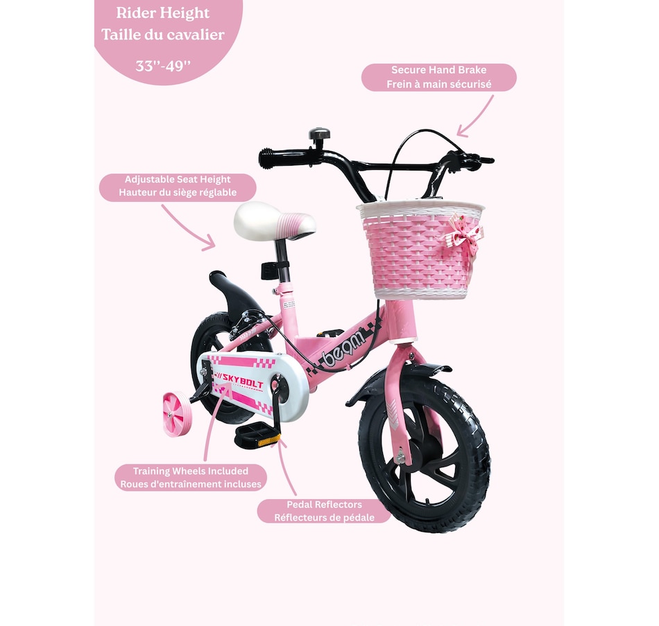 The Beam Sports 12" pink kids beginners bike with training wheels is the perfect first bike for children ages 2–5, designed to fit rider heights from 33"–49". Built for fun and safety, it features a responsive front hand brake paired with a rear pedal brake for reliable stopping power, a cheerful handlebar bell, and a front basket for carrying small items. A full chain guard protects clothing and little fingers, while the adjustable seat means a comfortable fit as your child grows. Pedal reflectors to improve visibility, and the included training wheels provide stability to help young riders gain confidence. With its bright pink finish and beginner-friendly design, this bike makes every ride safe, comfortable, and exciting. It offers a quick and hassle-free assembly (tools included).