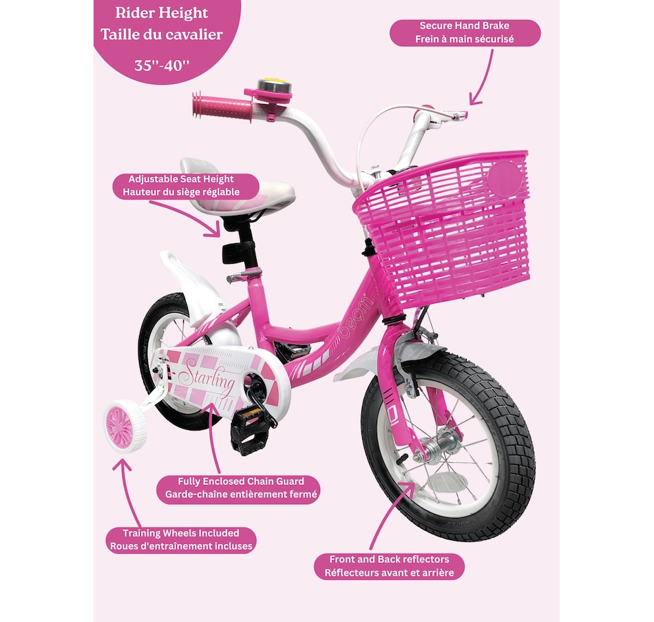 The Beam Sports 12" kids bike with training wheels is the perfect first ride for little adventurers ages 2–5, designed to fit riders 35"–40" tall. Built with safety and fun in mind, it features a responsive front hand brake for added control, a cheerful handlebar bell, and a charming pink front basket for carrying small treasures. A full chain guard protects fingers and clothing, while training wheels provide extra stability. The height-adjustable seat allows for a comfortable fit as your child grows, and wheel reflectors along with plastic pedal reflectors improve visibility during every ride. Quick and hassle-free assembly (tools included) means your little one will be ready to ride in no time!
