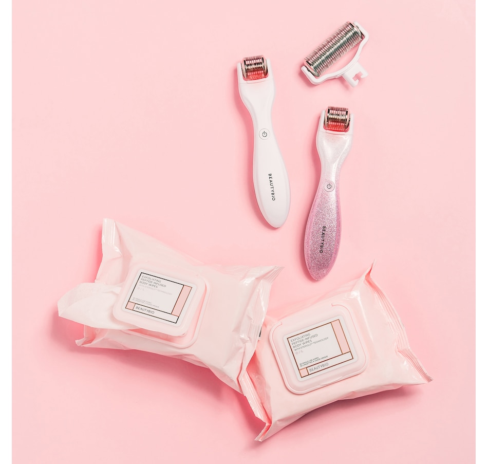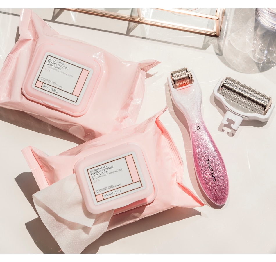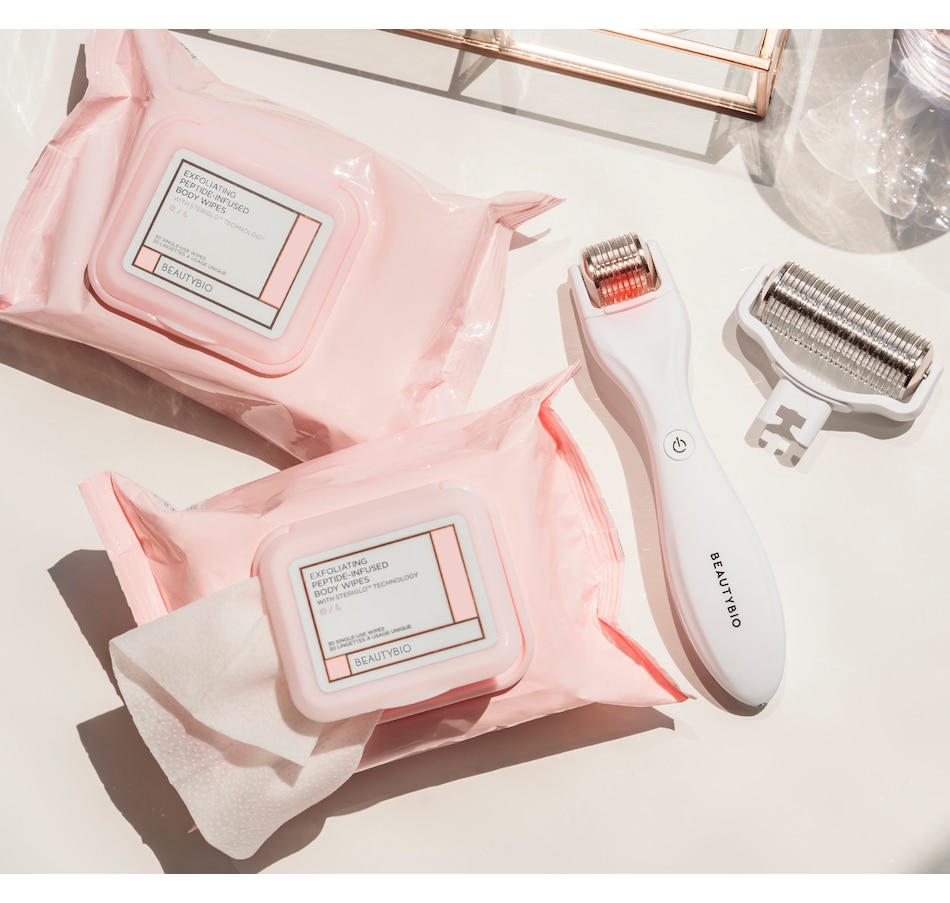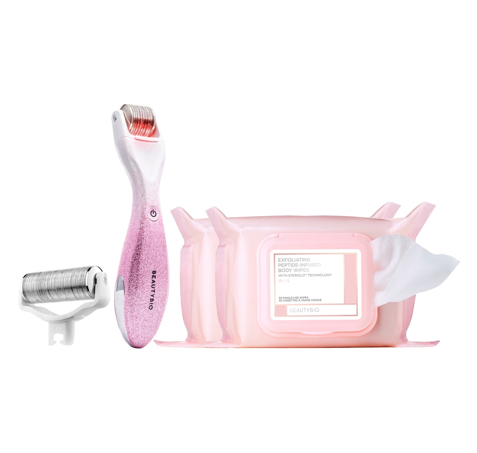 This set has everything you need to bring out the best in your skin. The GloPro is a patented, award-winning microneedling tool that amplifies skincare absorption and helps create firmer, smoother skin. Also included with your microneedling system are the brand's peptide infused body wipes with glow-promoting, firming peptides that instantly clarify skin on-the-go and before GloPRO® use. It immediately eliminates harmful bacteria on the skin - even P. bacteria that causes acne. They're also dual-sided for instant exfoliation and glowing hydration.