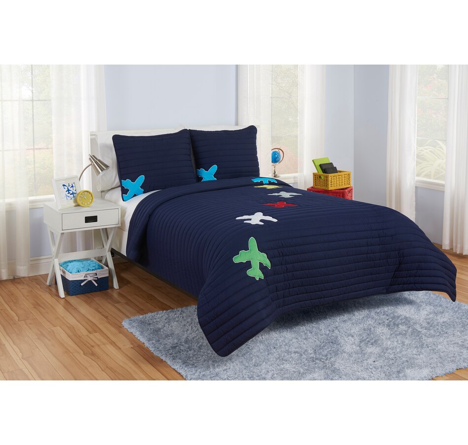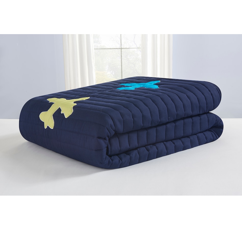 For your little pilot-in-the-making, look no further than the "Junior Aviator" set. The navy-blue coverlet and matching sham(s) feature a subtle piping around their edges and the slightest stitching in a vertical pattern across the top. These simple details add a hint fluffiness and volume—your little darling will love getting cozy among the quilt’s undulating waves. Cruising in an S-formation, from one corner of the coverlet to another, are six super-cute airplane cutouts in green, white, red, soft grey, yellow and sky blue; the sky-blue cutout also makes an appearance on the sham(s).