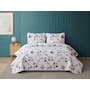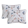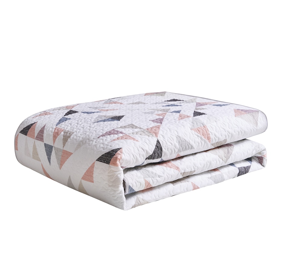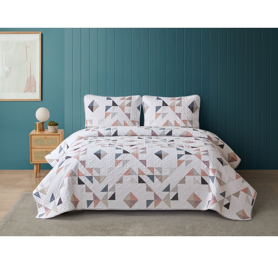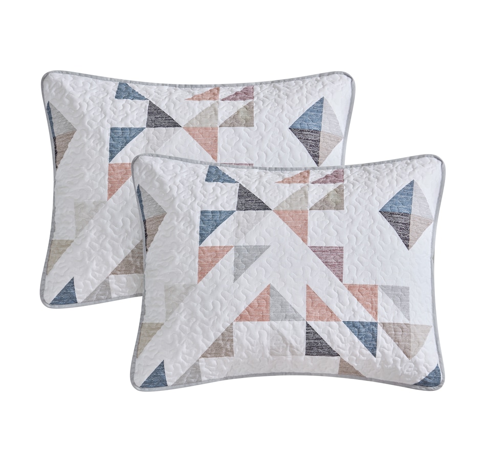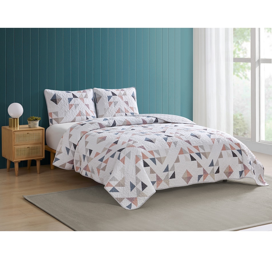 Refreshing your bedding is as easy as introducing this soft and breathable three-piece set, made from 100% cotton. Covering the white quilt and two matching shams are little triangles arranged in a fun, geometric pattern. The triangles are in muted shades of blue, grey, and red so you do not have to worry about this set clashing with your existing decor. Look closer at the pattern to find thin and faint, wavy lines in the background, bringing a little extra whimsy to the set. A simple, light grey border trims the quilt and shams. That same grey is also found on the quilt’s solid reverse. This set’s fabric is low maintenance, as everything is machine washable and easy to care for.