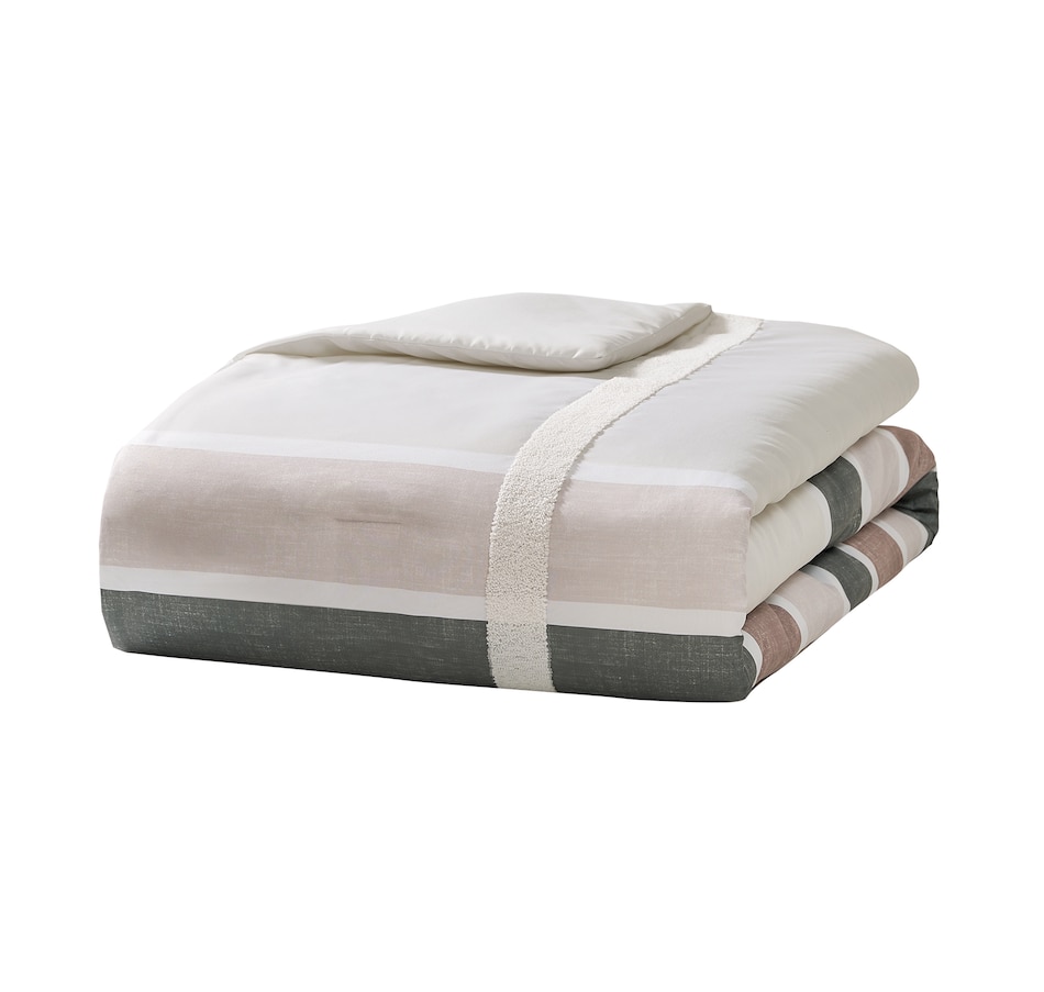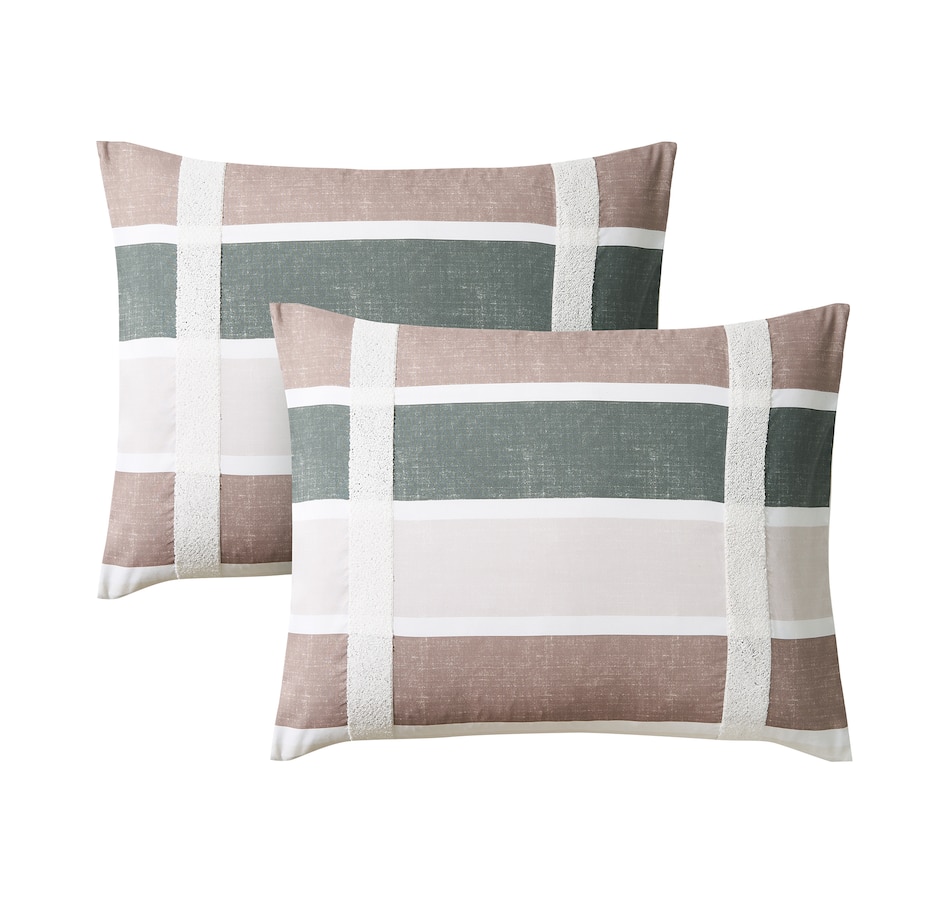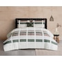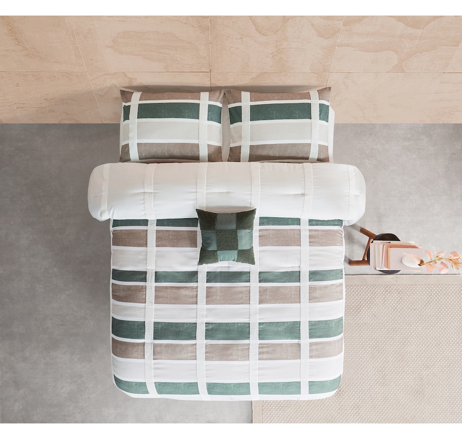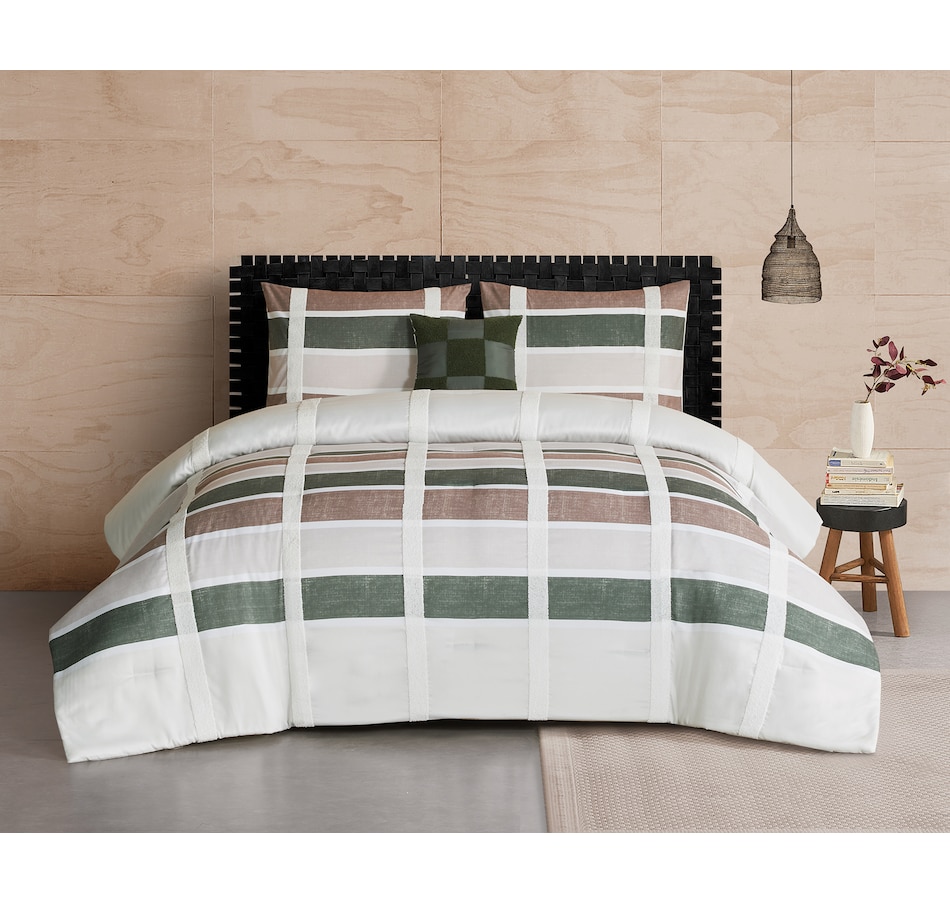Introduce a bold, eye-catching pattern into your bedroom with this dapper four-piece set. Covering the comforter and two matching shams are rectangular blocks of varying sizes, arranged neatly into vertical channels. The blocks are printed in earthy tones of green, beige, tan, and cream. The pattern may be commanding, but the muted colour palette offers a nice balance. Between each channel of printed blocks is chenille embroidery, providing this set with some wonderful texture. Also included in this set is a decorative pillow in earthy green. The pillow also features chenille embroidery, creating a checkerboard pattern. This set is lightweight and made from a soft microfibre. It is machine washable and easy to care for.