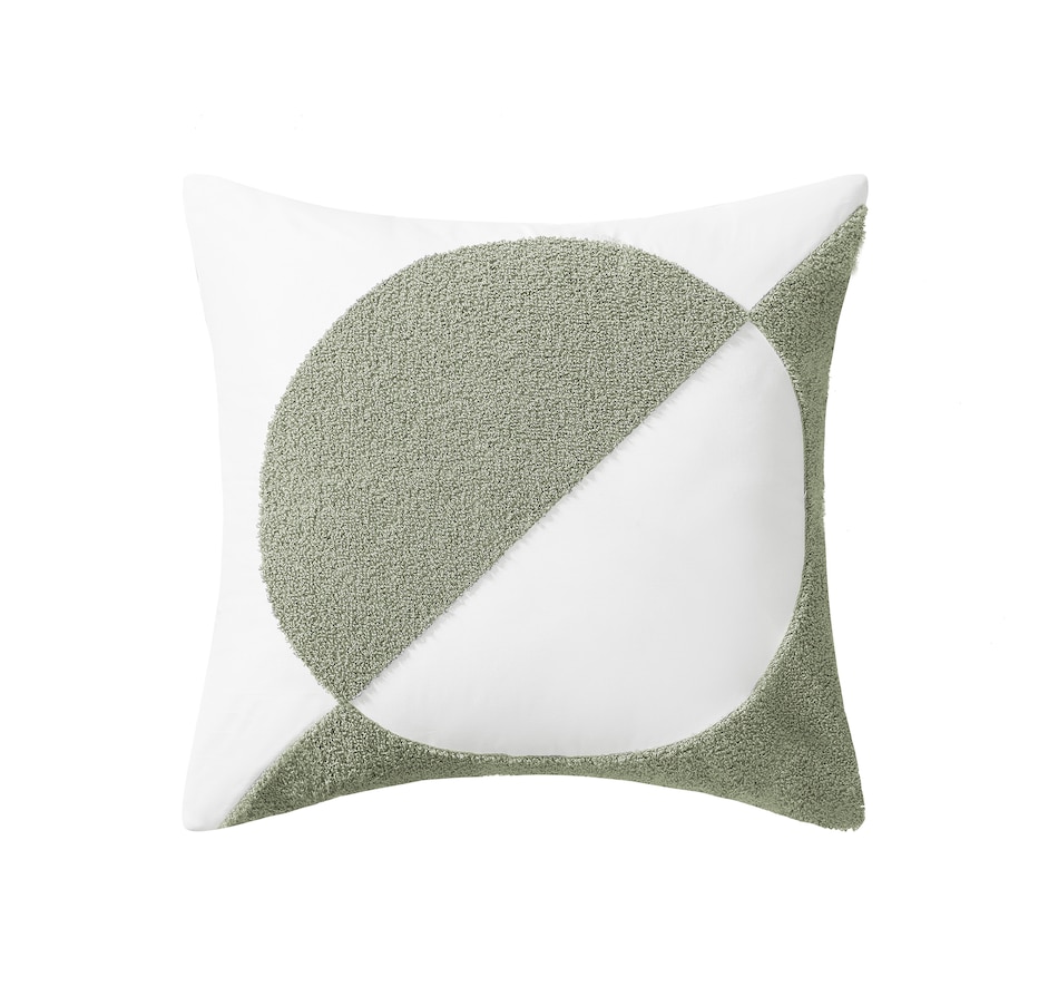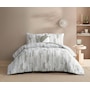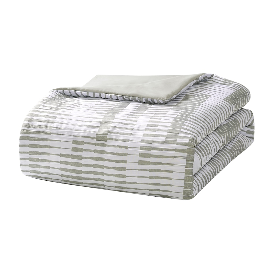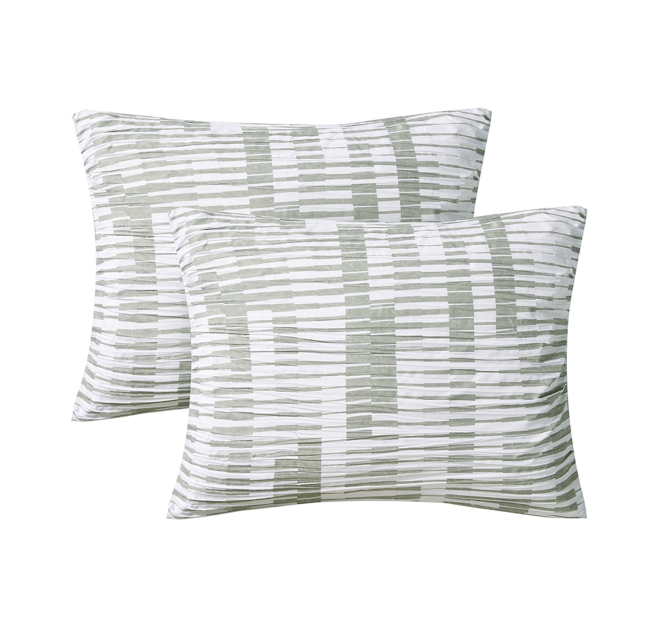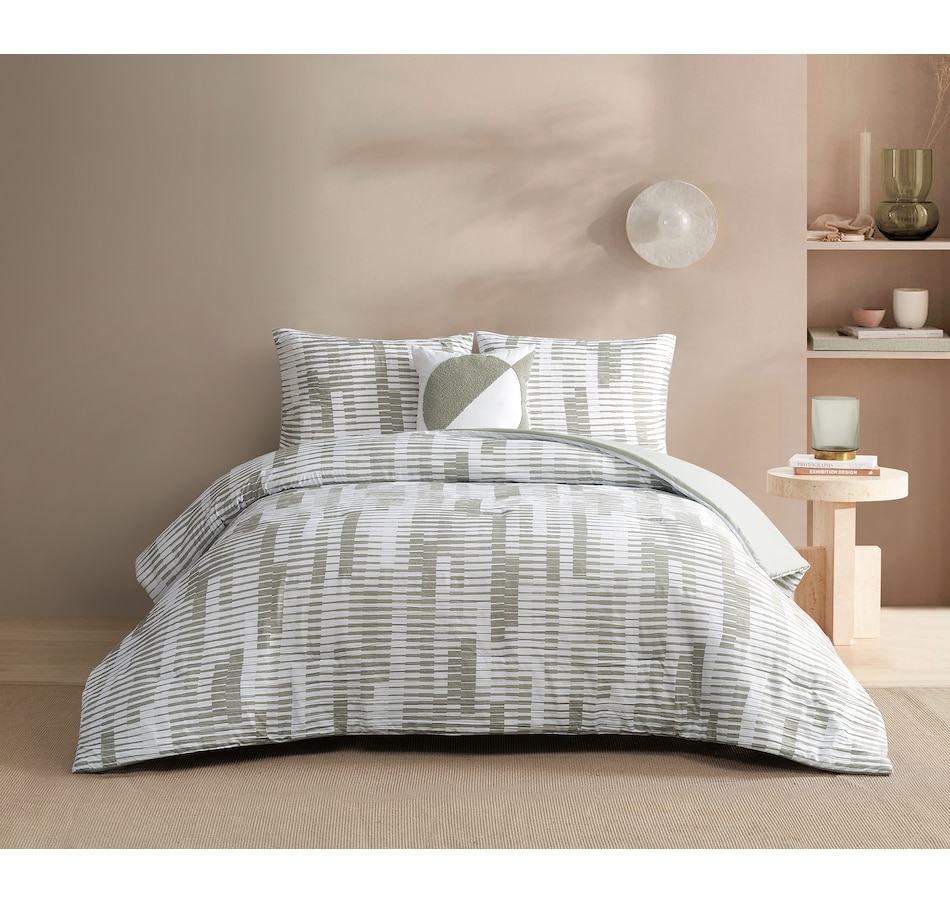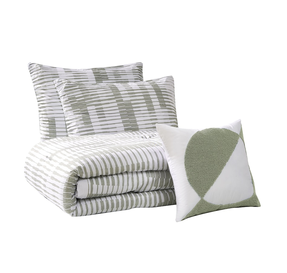 Make your bed the stylish focal point of the room with this unique four-piece set. Offered in earthy green tones, an unusual yet appealing pattern made up of different vertical dashes covers the comforter and two matching shams. For added visual interest, this linear print is combined with an attractive crinkle texture. The white background of these items brightens this set. Flip over the comforter to find a solid earthy green reverse. To complete this set is a decorative pillow, featuring a green and white geometric pattern in chenille embroidery. You will sleep soundly and comfortably in the embrace of this set, made from soft microfibre fabric. It is durable and will easily withstand being tossed into the washing machine.