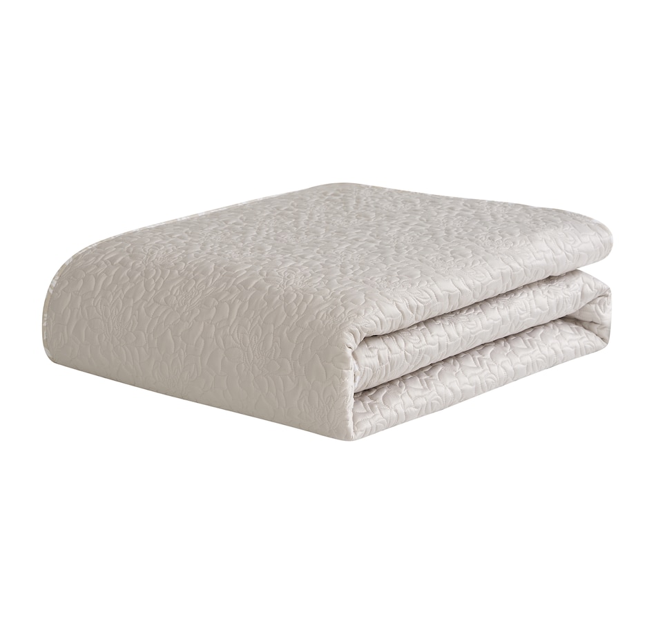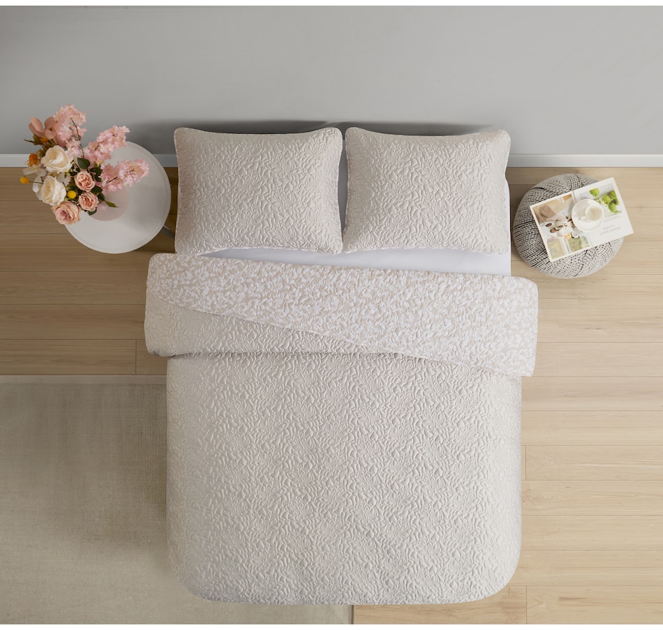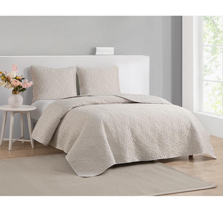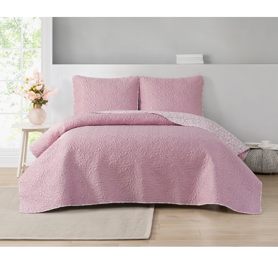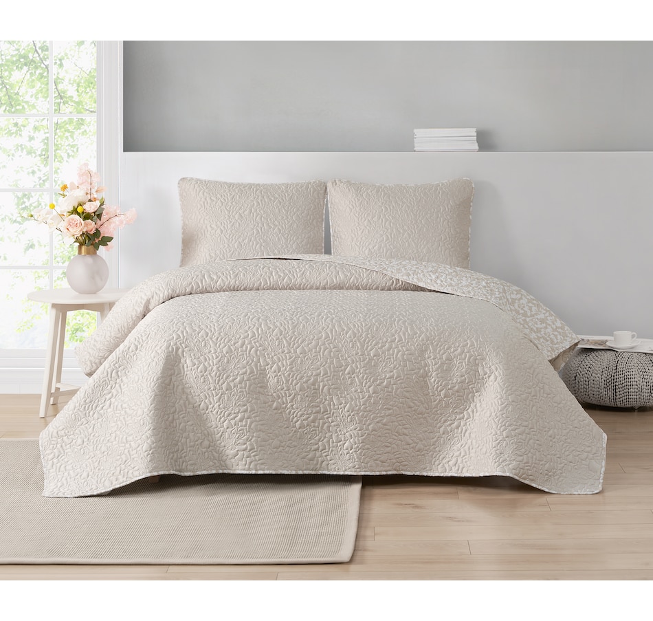 On the face of this soft matte satin quilt and two matching shams are outlines of big beautiful flowers, created using the quilt’s stitching. The flowers appear against a solid background, so you don't have to worry about this tastefully understated set stealing focus from the rest of your decor. You can flip over the quilt to find a more dynamic botanical pattern. The solid background on the soft microfibre reverse matches the solid, but this time the flowers covering it are white and have been filled in. That floral pattern also appears on the quilt and shams’ borders, making for a delightful and subtle detail. This three-piece set will keep you warm and comfortable as you sleep, and it is machine washable too.
