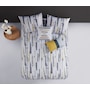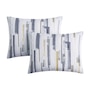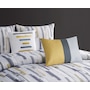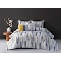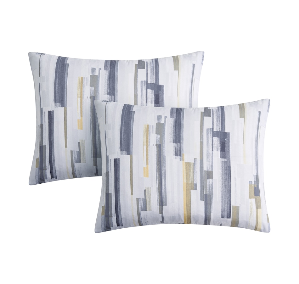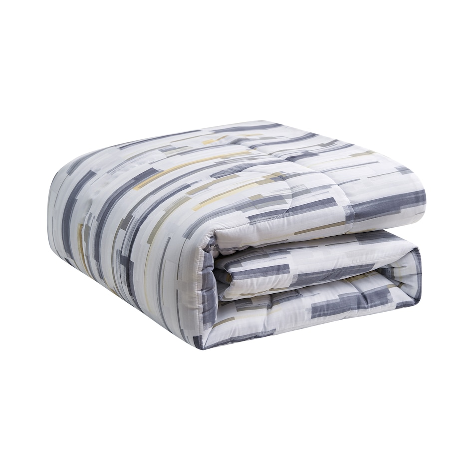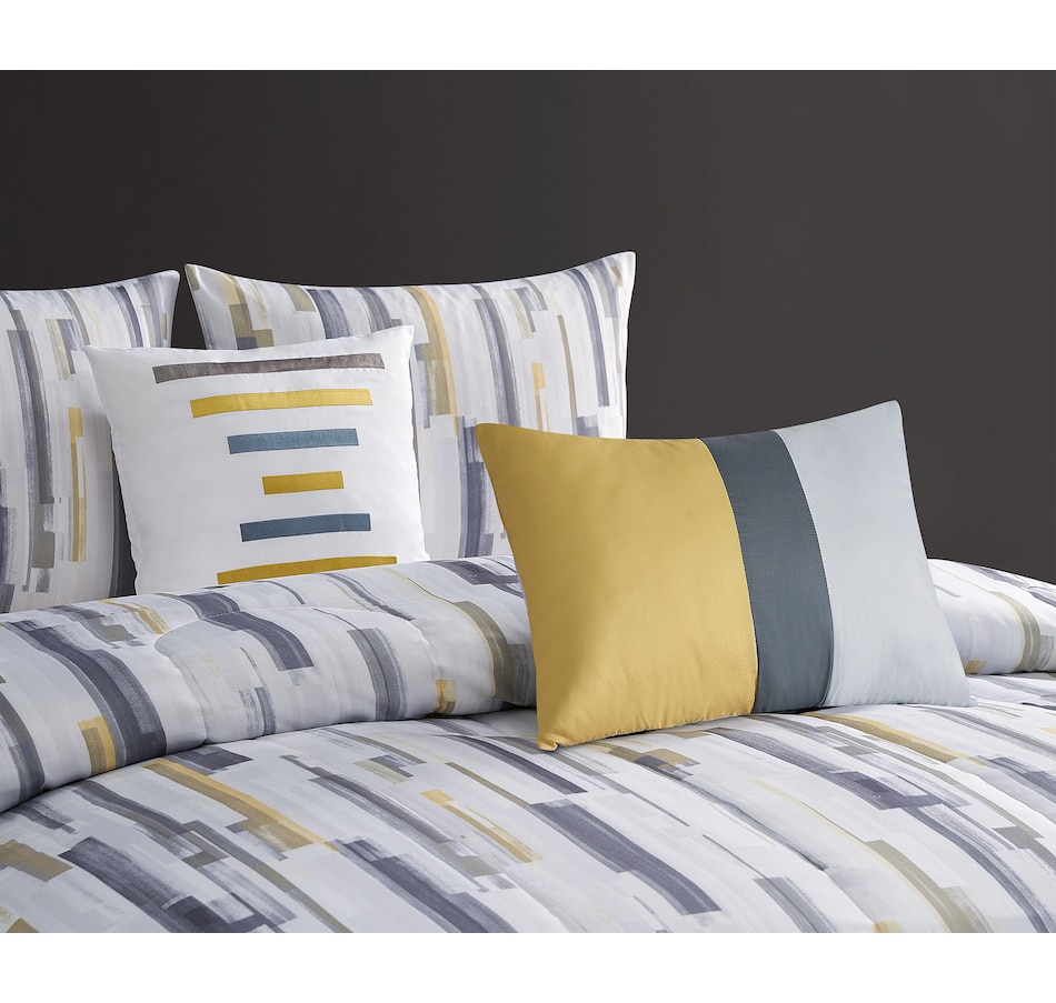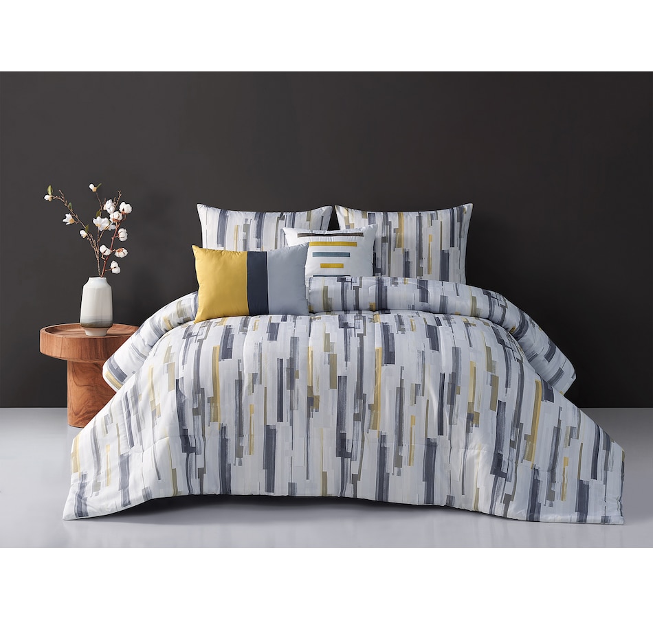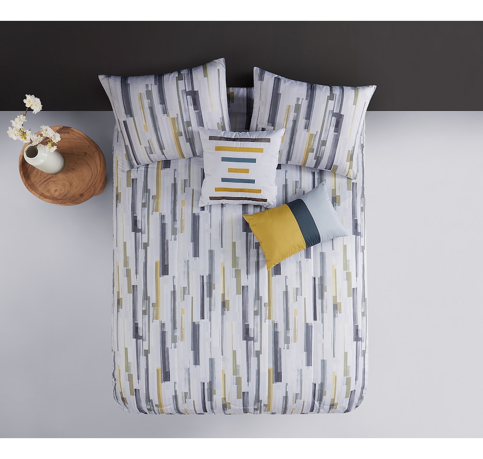The mid-century inspired print adorning the top of this comforter and its two matching shams is bold and striking, made up of vertical dashes, all askew and overlapping each other. With an explosive pattern like this one, the colour palette is made up of soft white, greys, yellow, and green, so you don’t have to worry about this machine washable set clashing with your existing decor. The comforter’s fill is made from 100% polyester and has a solid grey reverse. Also included in this five (5)-piece super soft microfiber set are two decorative pillows. One is 18" x 18" in size and features applique stripes in grey and green over a white ground. The other is 14" x 20" and boasts three solid-pieced coloured blocks, with green on the left, light grey on the right, and then a narrow dark grey band separating the two.