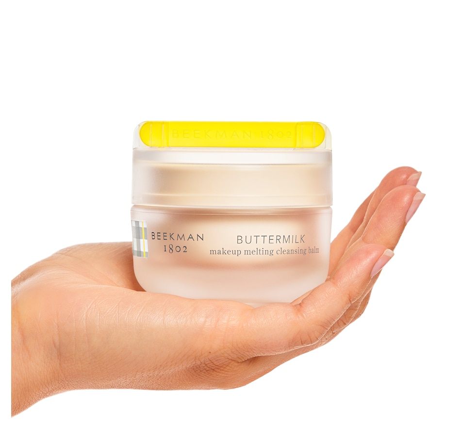 On contact with water, the Beekman 1802 Buttermilk Makeup Melting Cleansing Balm transforms from a buttery balm into a deep cleansing milk that gently melts all traces of dirt, makeup and, sunscreen, then rinses away cleanly to leave behind healthy, radiant skin.