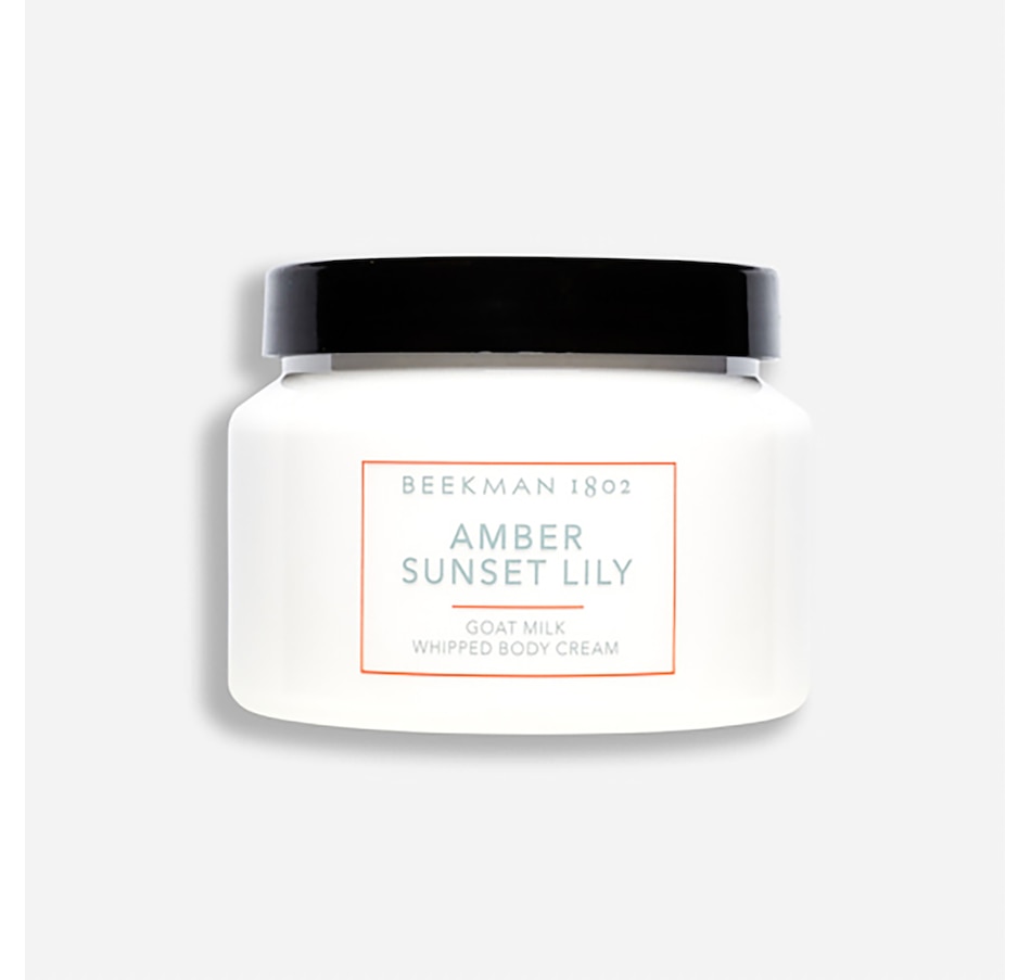 Enjoy this super-size goat-milk whipped body cream from Beekman 1802. It melts into your skin, with creamy butters and other key ingredients that soften and moisturize. The Amber Sunset Lily scented features notes of pink lilies and lemon leaf that lay on a soft base of lilac and cedarwood.