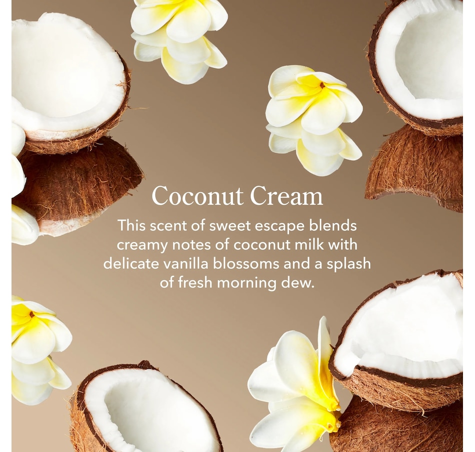 - Coconut Cream – this scent of sweet escape blends creamy notes of coconut milk with delicate vanilla blossoms and a splash of fresh morning dew