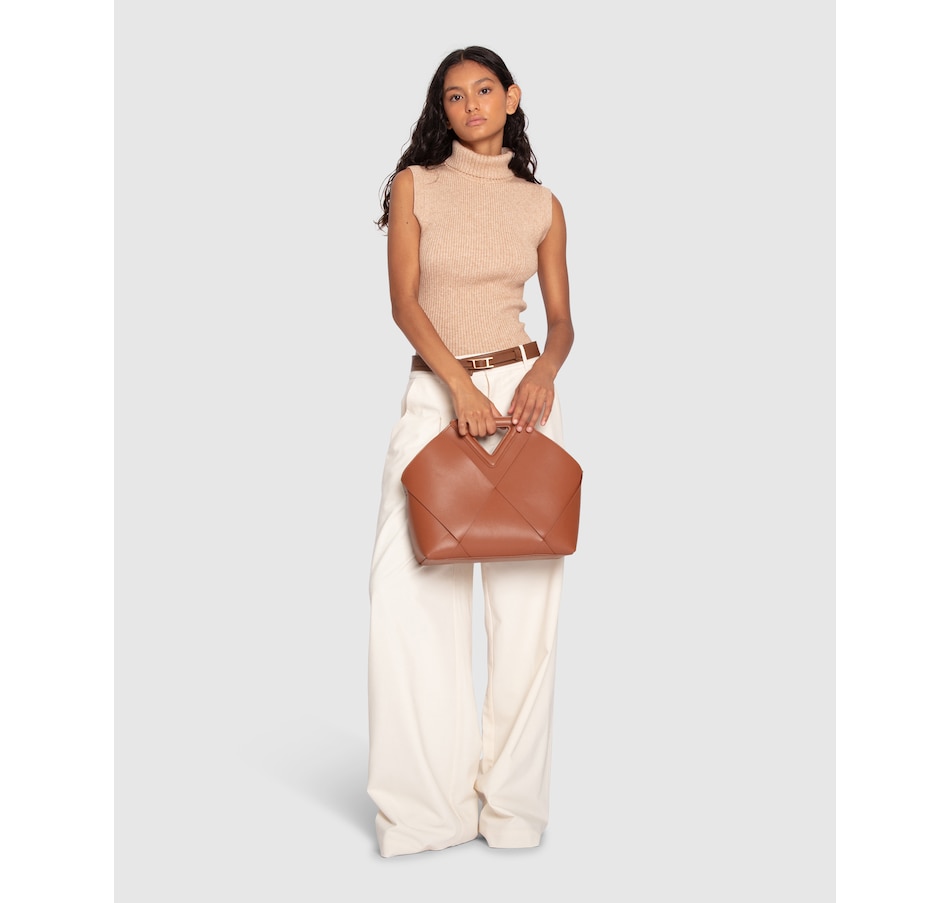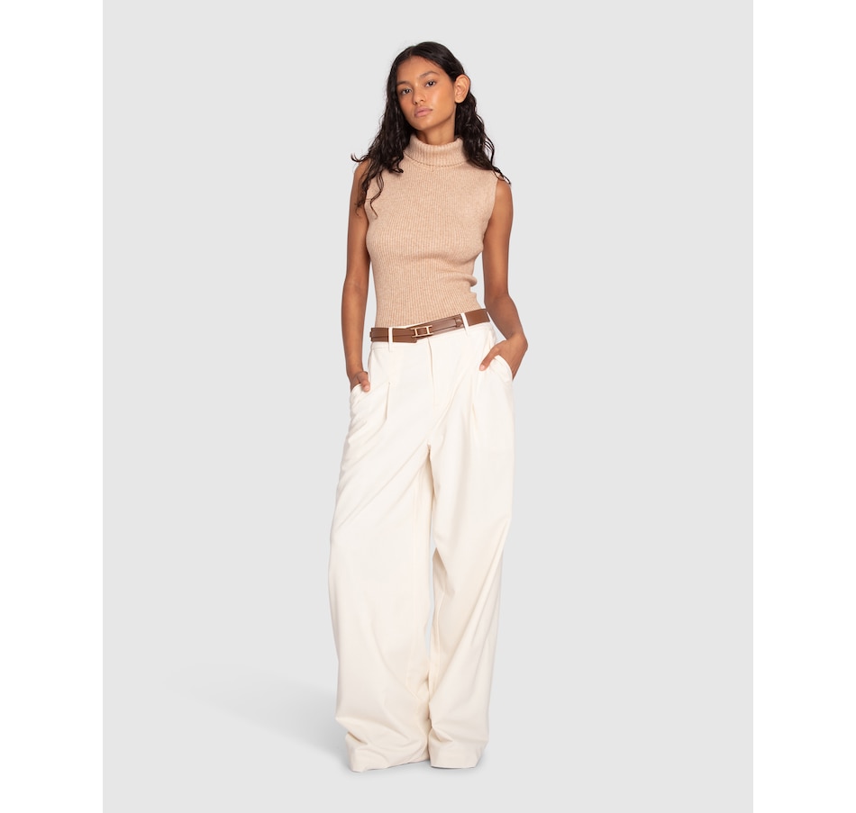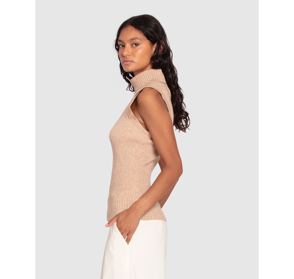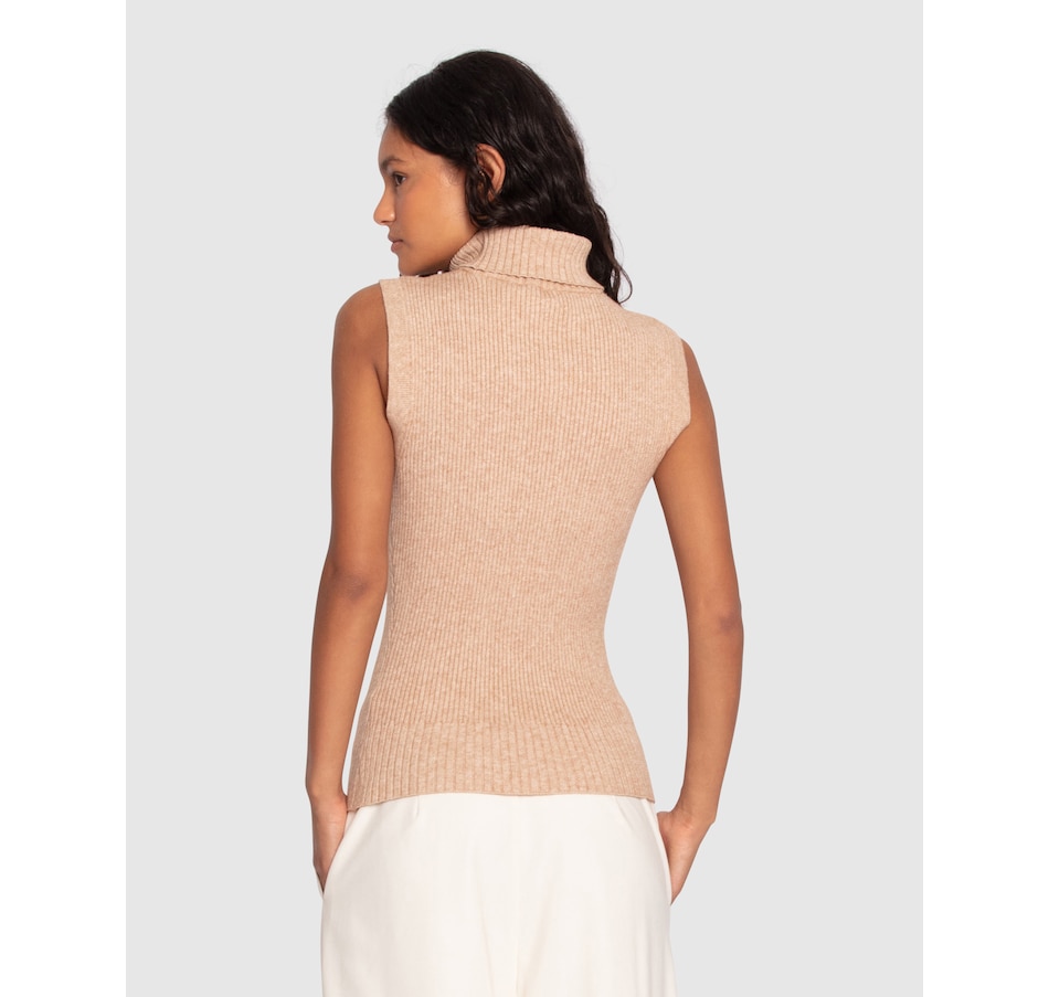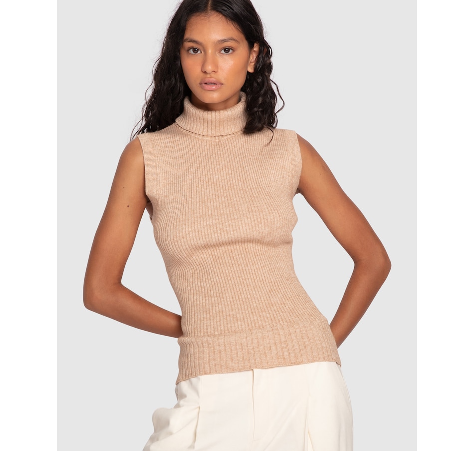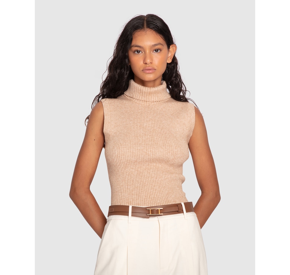 The Equation Sleeveless Turtleneck Knit is a refined essential that blends sophistication with modern ease. Designed for a sleek, form-fitting silhouette, this top features a ribbed texture that enhances its flattering shape. The high roll-neck adds a touch of elegance, while the sleeveless cut makes it a versatile layering piece. Crafted from a soft viscose-blend, it delivers comfort with a luxurious feel—perfect for effortless styling from day to night.