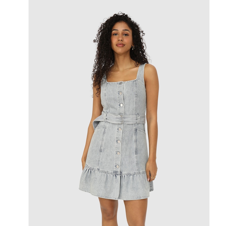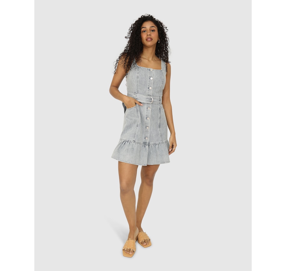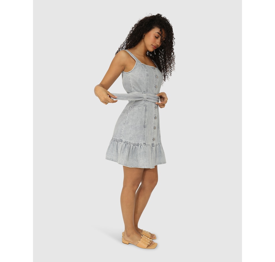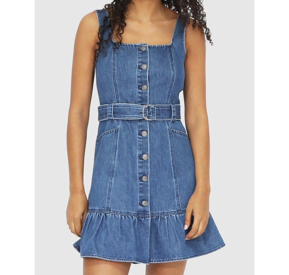 The Reunite Denim Mini Dress is the second coming of favourite Rendezvous Denim Mini Dress a denim mini dress elevated, perfect for around town or weekends away. It features a square neckline, button up front, pockets and a matching waist tie. It's cute and perfect for casual day or vacation statement piece and everything in between. Dress it down with flats/sneakers or up with heeled sandals!