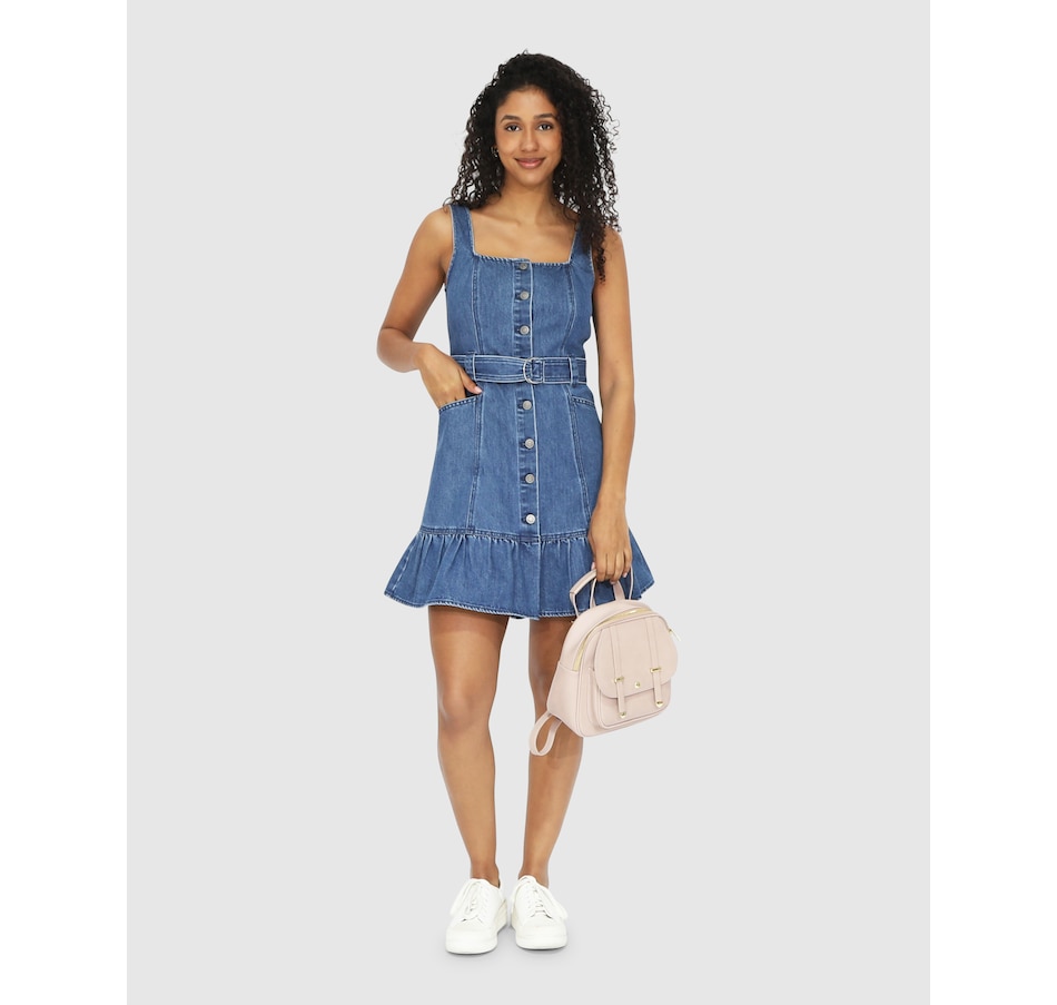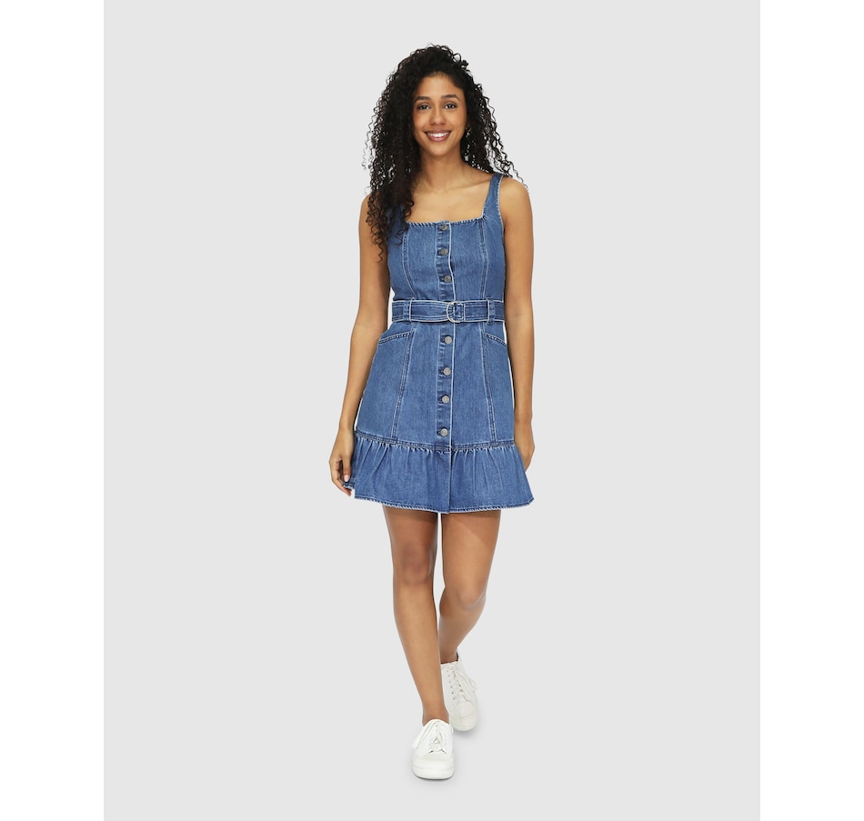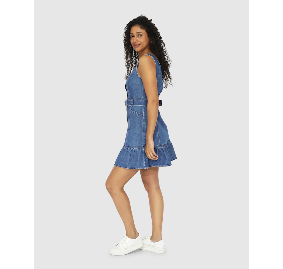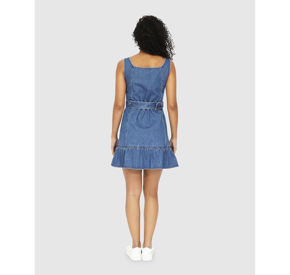 The Reunite Denim Mini Dress is the second coming of favourite Rendezvous Denim Mini Dress a denim mini dress elevated, perfect for around town or weekends away. It features a square neckline, button up front, pockets and a matching waist tie. It's cute and perfect for casual day or vacation statement piece and everything in between. Dress it down with flats/sneakers or up with heeled sandals!
