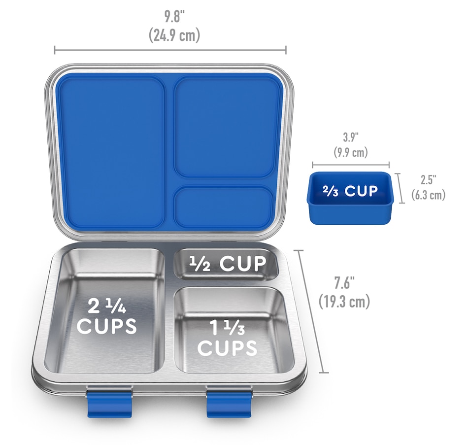 • Includes three food compartments portioned perfectly to fit a child’s appetite (recommended for ages three and up). Plus, a removable silicone container for packing even more food options