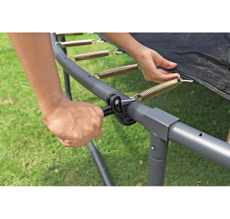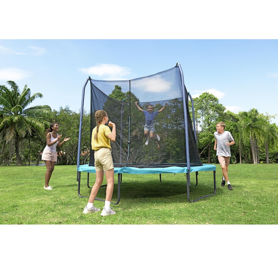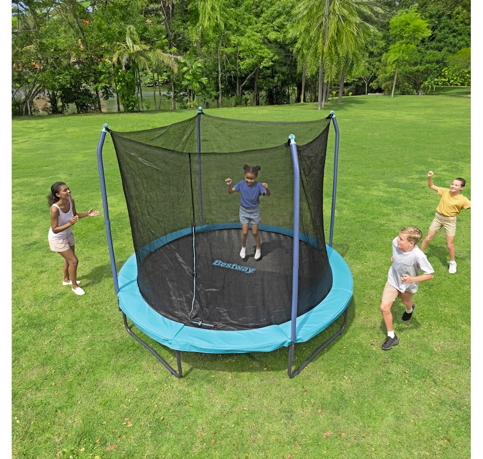Get ready for some serious bouncing fun with the Bestway 10-Foot Xtreme Air Trampoline! Designed for jumpers aged six and up, this trampoline offers plenty of room to leap, flip and bounce with its spacious 10' x 8'4" design. It's built to last with a strong powder-coated galvanized steel frame and a super-durable, UV-resistant, non-slip polypropylene jumping mat; the UV-resistant polyethylene enclosure net helps keep you safe inside; and the cushy spring pad, wrapped in EPE foam and PVC and PE, helps ensure a soft, safe landing. With a 200-pound weight capacity, this trampoline can handle all the high-flying fun! Time to jump into action!
