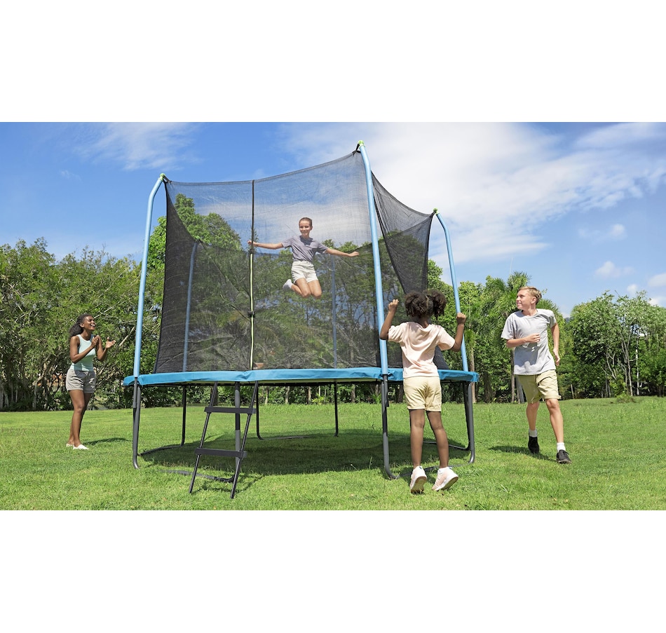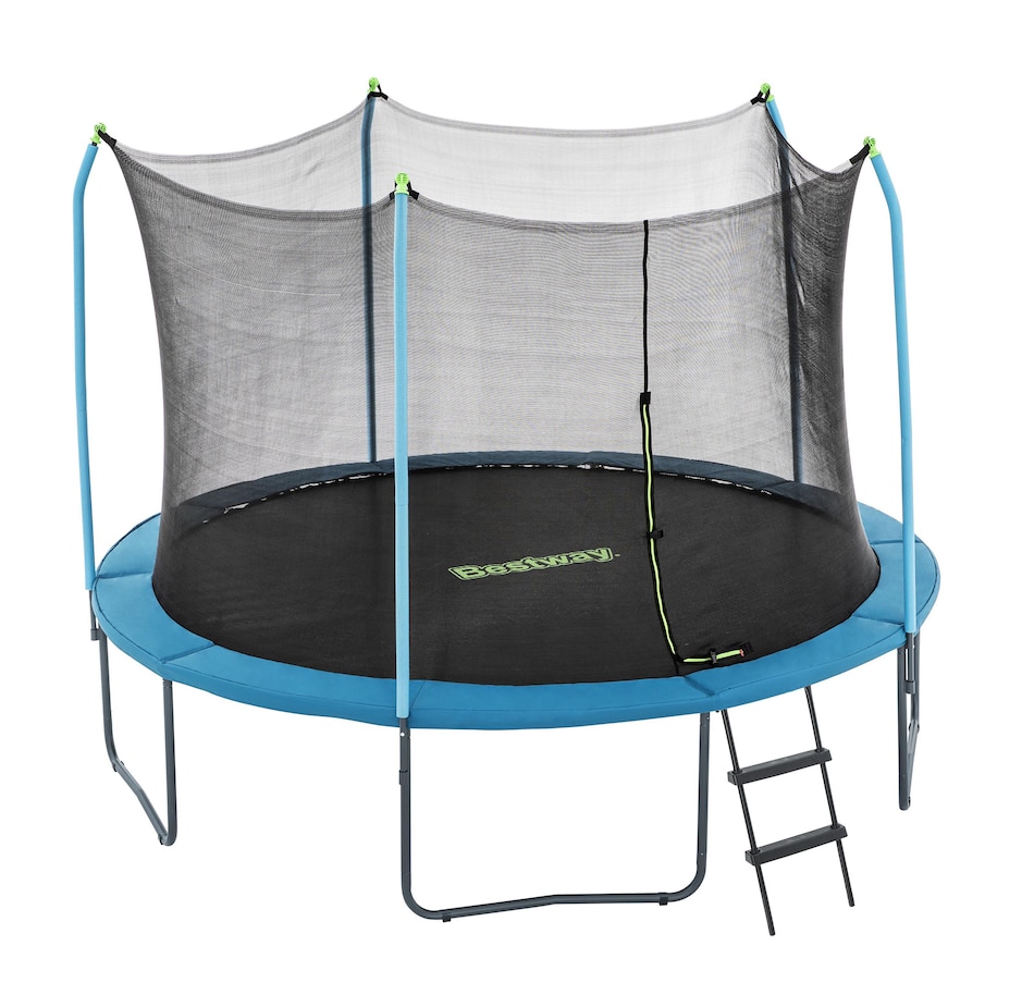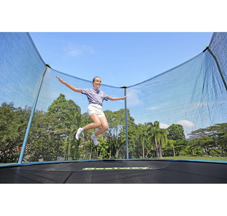 Get ready to take your jumping game to the next level with the Bestway 12' Xtreme Air Trampoline! Perfect for kids aged six and up, this massive trampoline offers plenty of room to bounce, flip and soar with its 12' x 9'1" size. Built to last with a powder-coated galvanized steel frame, it’s made for serious fun, holding up to 220 pounds of bouncy energy. The UV-resistant, non-slip polypropylene jumping mat helps ensure a safe and smooth bounce, while the UV-resistant polyethylene enclosure net helps keep you safely inside. With an EPE foam spring pad wrapped in PVC and PE for extra protection, this trampoline is as sturdy as it is fun! Ready, set, jump—adventure awaits!