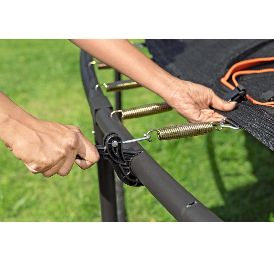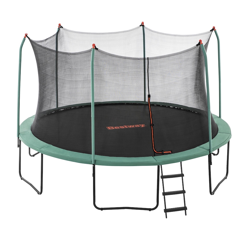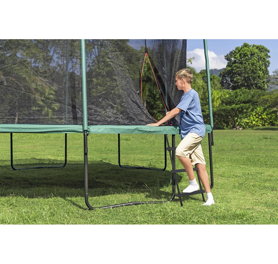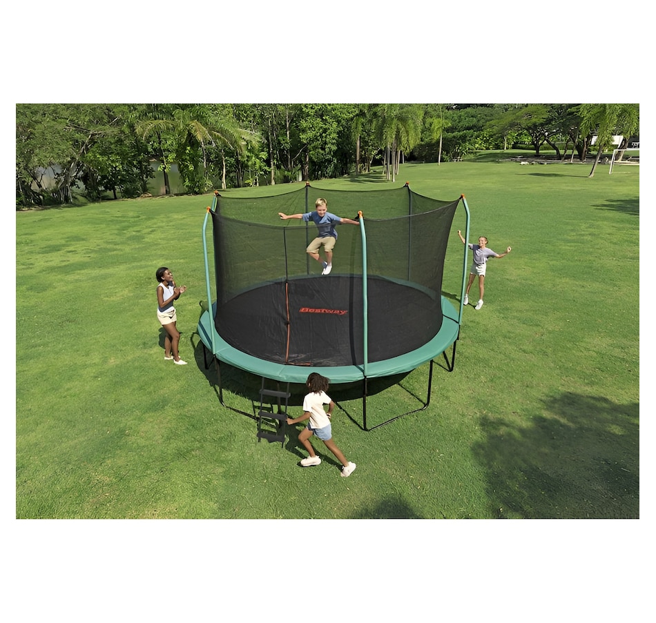 Get ready to jump higher, flip farther and have a blast with the Bestway 14' Xtreme Air Trampoline! Perfect for adventurers aged six and up, this massive trampoline gives you a giant 14' x 9'4.5" jumping space—ideal for big air and big fun! It's built tough with a powder-coated galvanized steel frame, and can handle up to 250 pounds of pure bouncy energy. The UV-resistant, non-slip polypropylene jumping mat helps ensure that you're always in control, while the UV-resistant polyethylene enclosure net helps keep everyone safely inside. The EPE foam spring pad wrapped in durable PVC and PE adds extra protection, so you can jump worry-free! Time to take your backyard play to new heights!