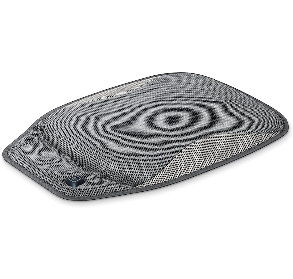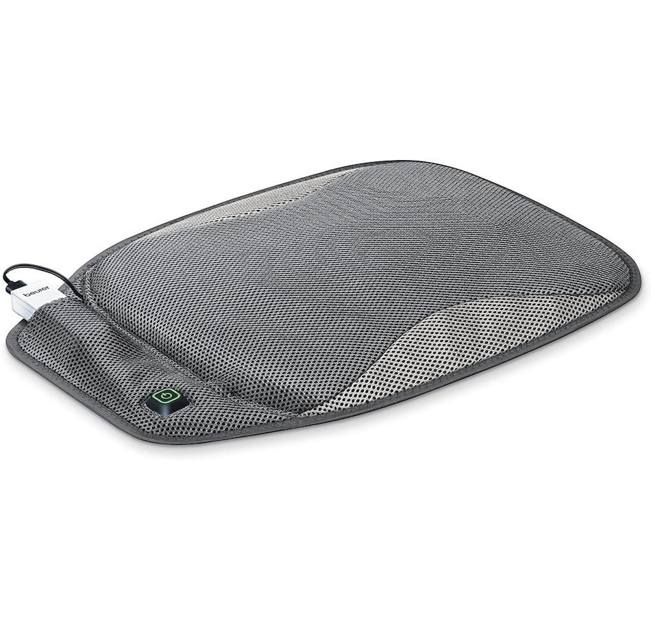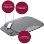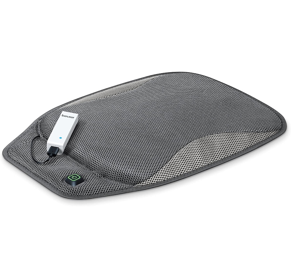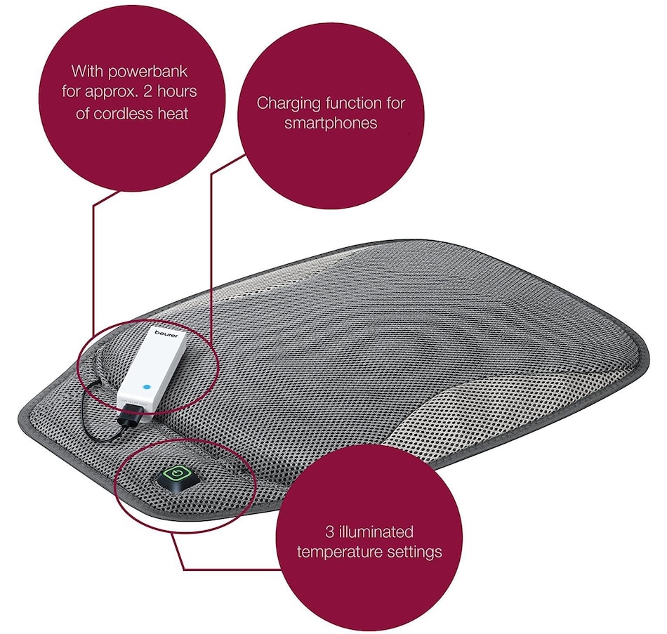 This pad has a high-performance lithium-ion battery, with approximately 2 hours of battery life. It also has a Charging function for smartphones, 3 temperature settings, Temperature monitoring with safety switch-off, automatic switch-off after approximately 110 min., and Illuminated temperature settings. The heating pad is also machine-washable at 30°C, and has a soft surface and durable underside. It includes a removable powerbank, charging cable, and a storage bag.