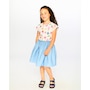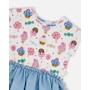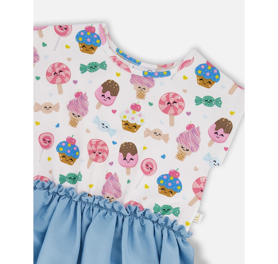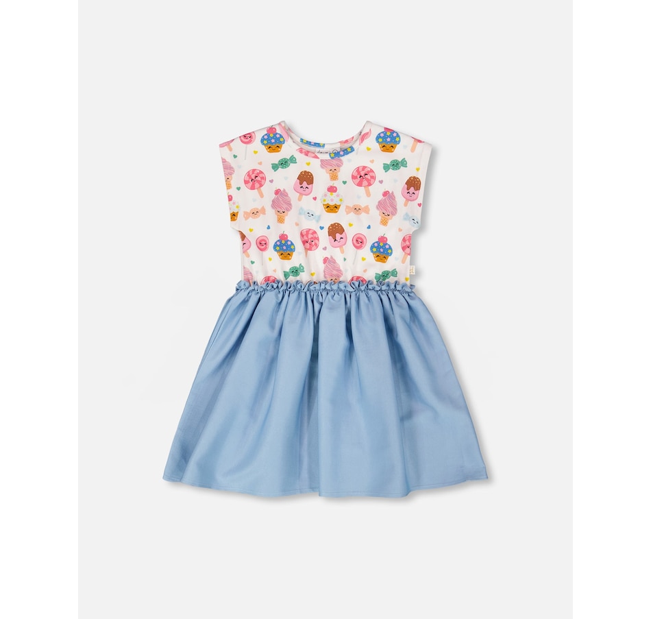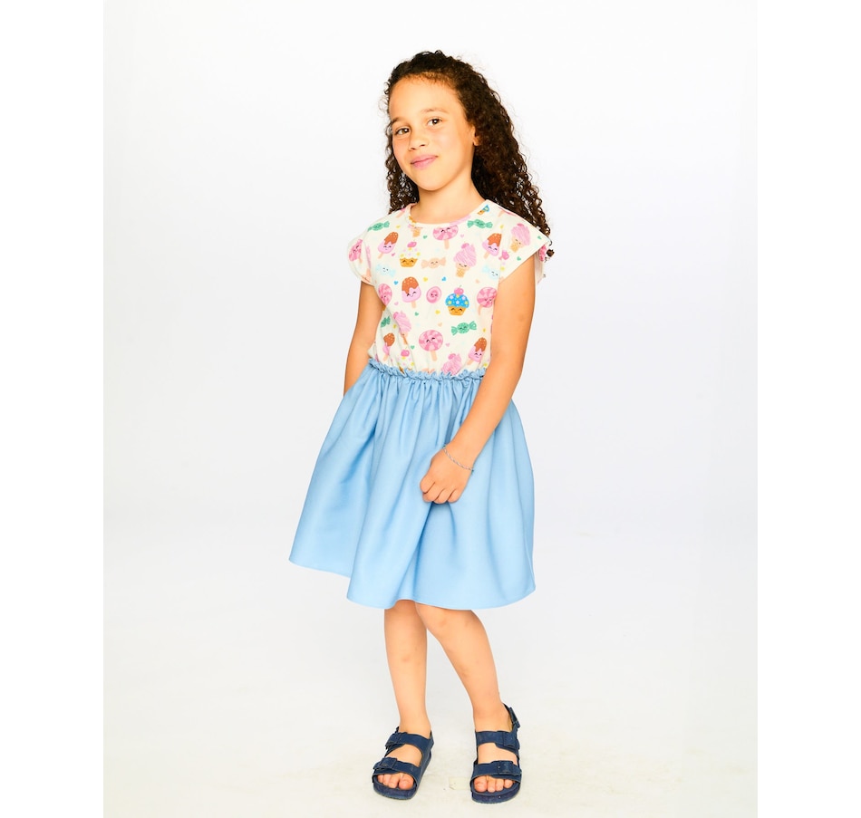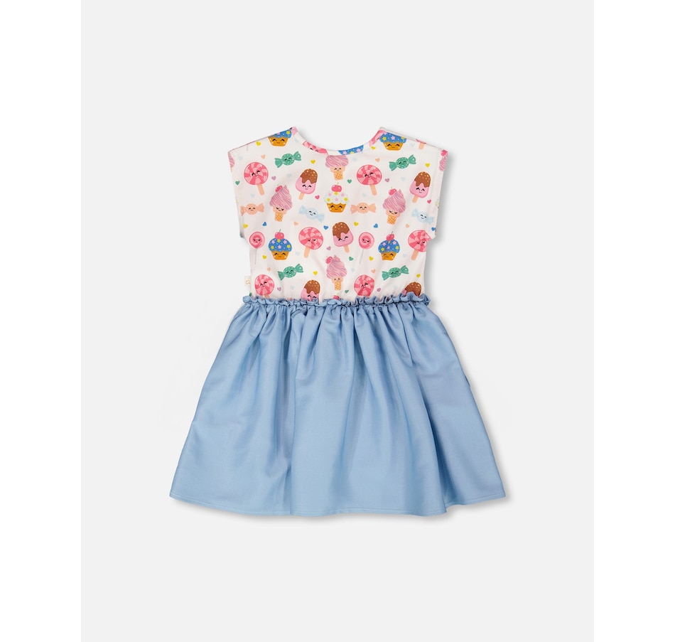 The bi-material dress in white with candy print is as sweet as it is stylish, perfect for little girls who love playful fashion. This fun dress features a jersey top with a colorful allover candy print — from lollipops to cupcakes — paired with a flared skirt in soft woven fabric that twirls with every step. A delicate tie at the waist completes the look, making it both practical and adorable for everyday adventures.