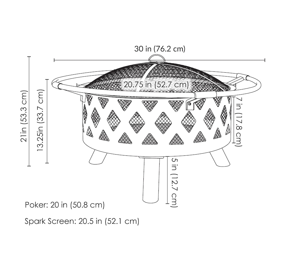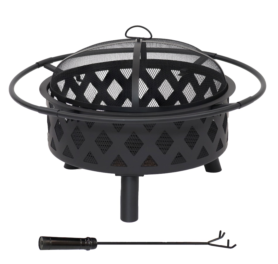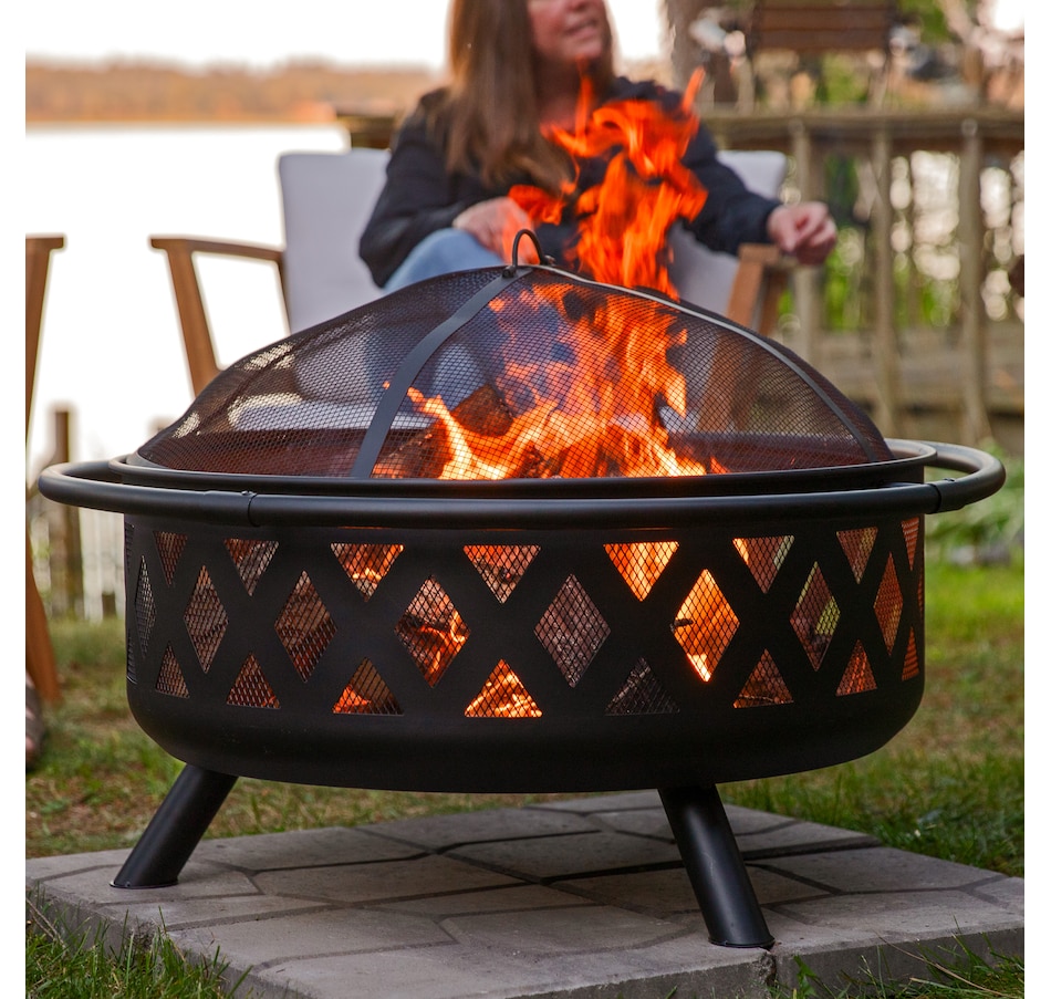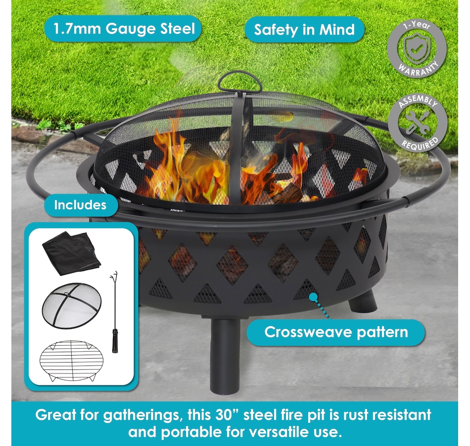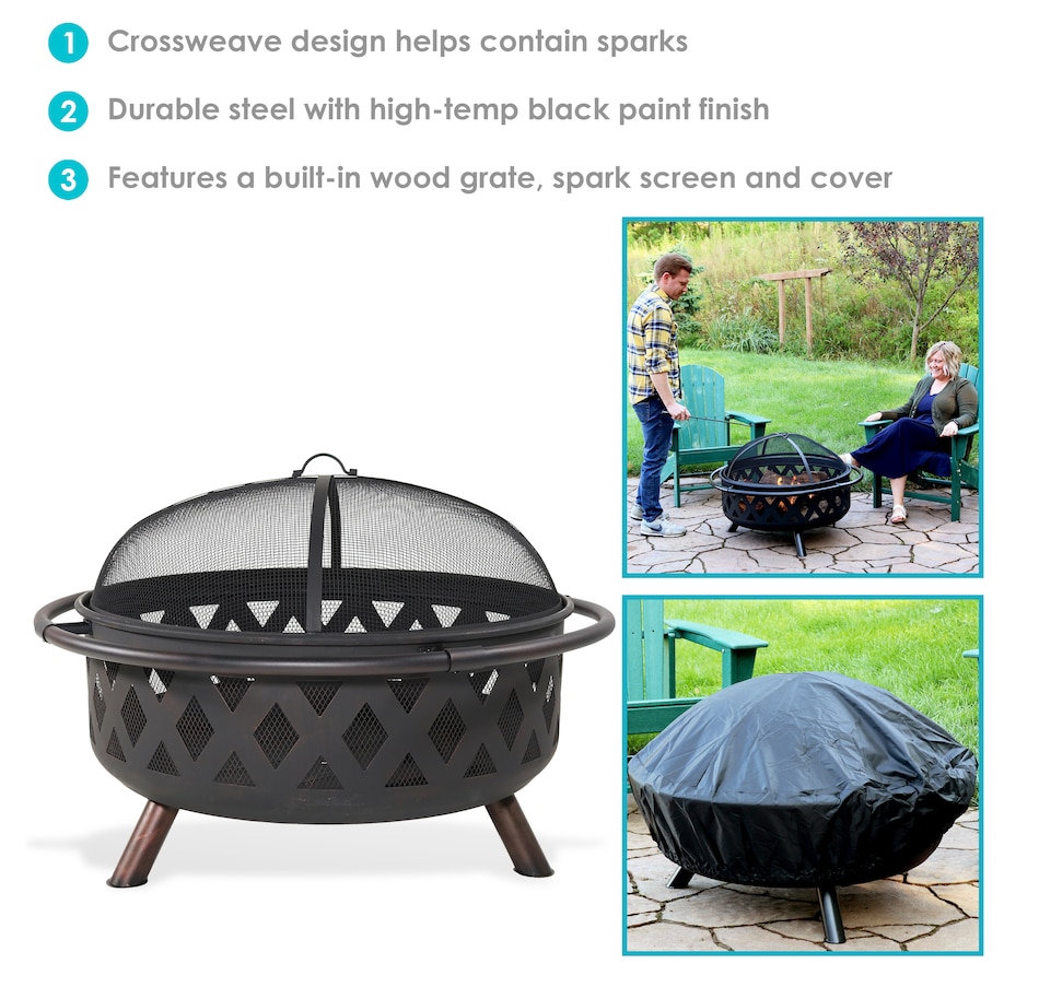 This firepit for outside provides ample room for a bonfire with family and friends on any patio, yard, or campsite. The overall fire pit is accented with a decorative crossweave pattern that glows at night to add style and charm to any outdoor space. This round fire pit comes with a mesh spark screen to keep flying embers contained and a log poker to easily maneuver the wood inside the pit safely. It also includes a weather-resistant cover to protect the fire pit from exposure to the elements when not in use. This wood-burning fire pit for outside is not designed to burn on a deck unless a fireproof pad is used. Enjoy this sturdy steel fire pit in any backyard or patio today.