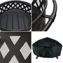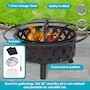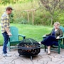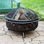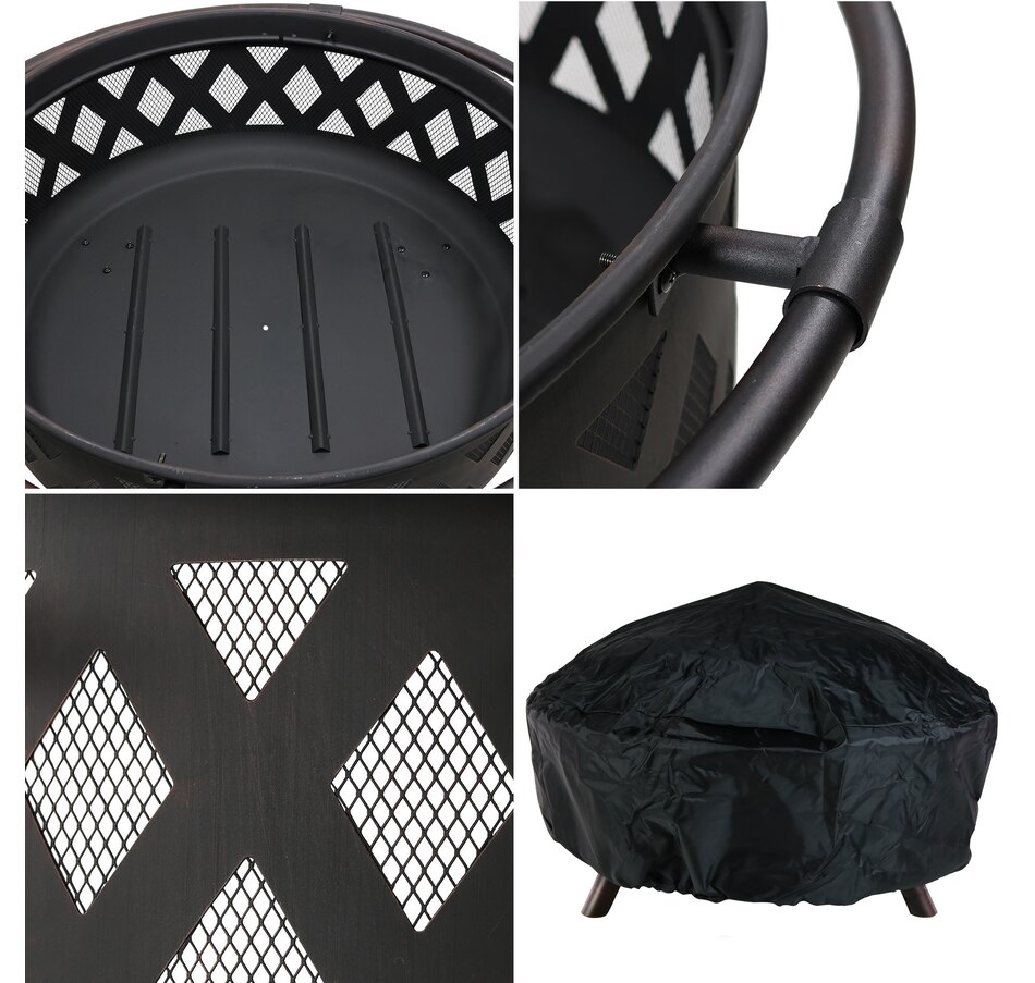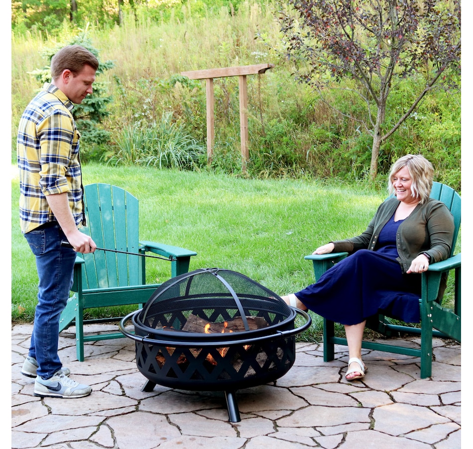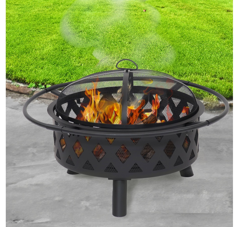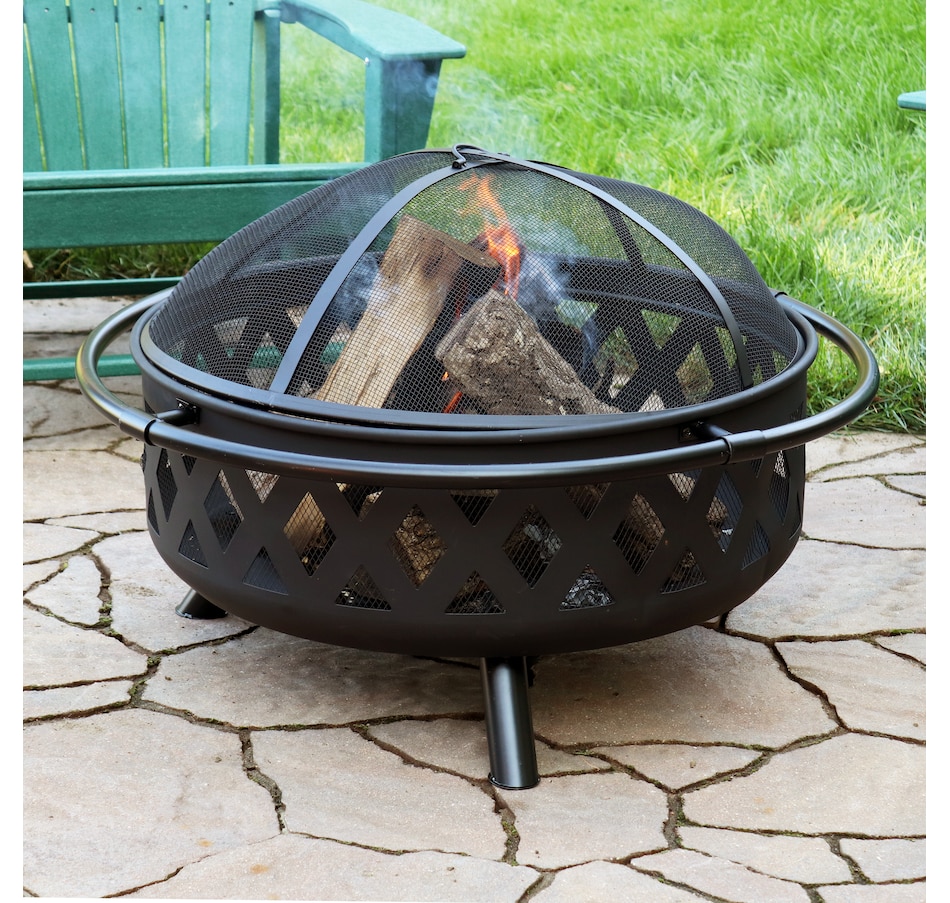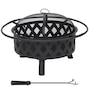 This firepit for outside provides ample room for a bonfire with family and friends on any patio, yard, or campsite. The overall fire pit is accented with a decorative crossweave pattern that glows at night to add style and charm to any outdoor space. This round fire pit comes with a mesh spark screen to keep flying embers contained and a log poker to easily maneuver the wood inside the pit safely. It also includes a weather-resistant cover to protect the fire pit from exposure to the elements when not in use. This wood-burning fire pit for outside is not designed to burn on a deck unless a fireproof pad is used. Enjoy this sturdy steel fire pit in any backyard or patio today.