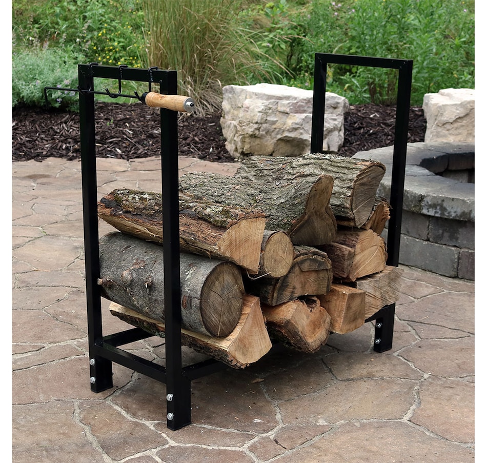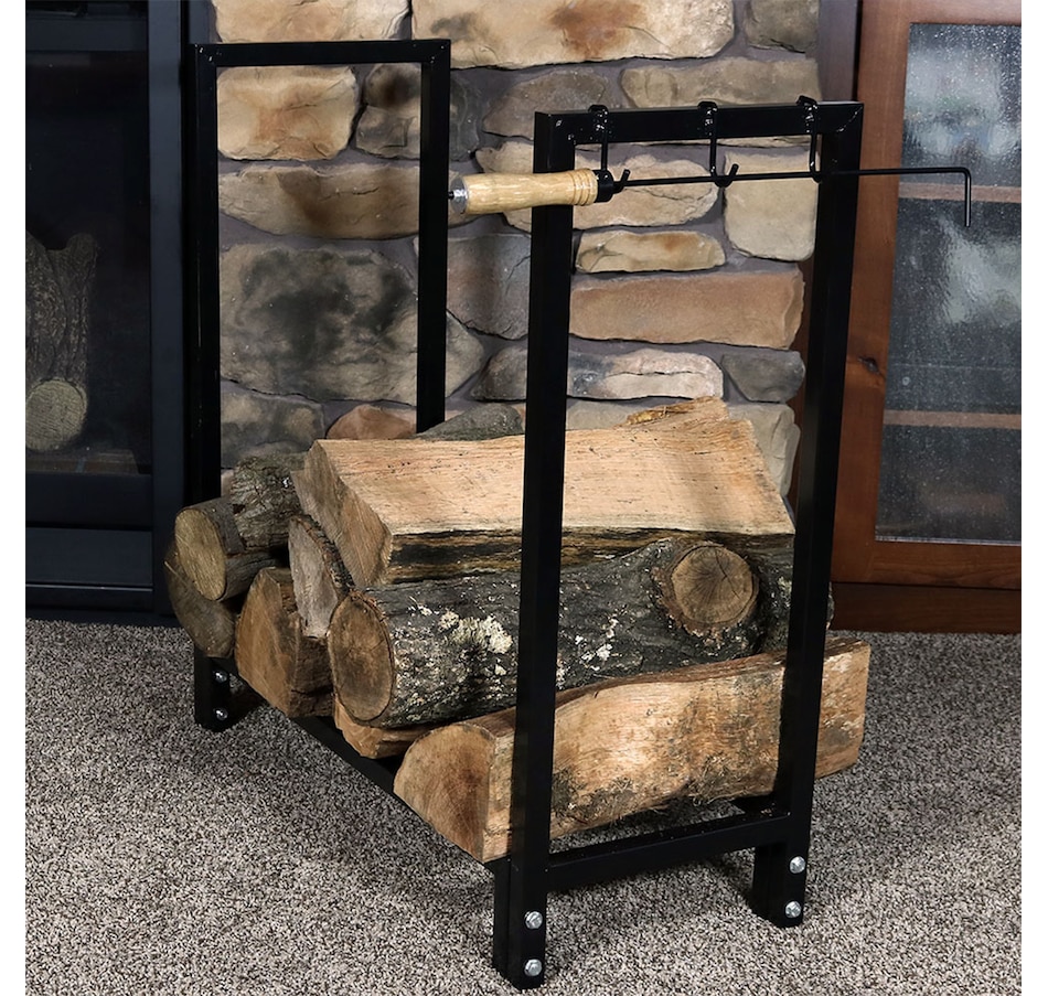 This compact yet durable log rack and cover set offers an efficient solution for keeping firewood organized, dry, and accessible in both indoor and outdoor spaces. Measuring 30.5 inches wide, 12 inches deep, and 30 inches tall, the rack holds approximately 1/8 cord of wood, making it a strong choice for small patios, decks, porches, or near an indoor fireplace. Constructed from heavy-duty steel, the rack is designed to withstand the elements and daily use, while the included cover—measuring 31 inches wide, 22 inches deep, and 26 inches tall—is made from water-resistant PVC to shield logs from rain, snow, and moisture. The slightly elevated base keeps the wood off the ground to improve airflow and help prevent rot or mildew. Built-in hooks on the side of the rack provide space to hang fire pit tools or kindling, combining practicality and space-saving design. This firewood rack with cover blends durability and convenience for year-round wood storage.