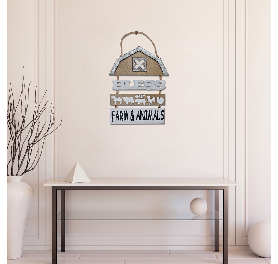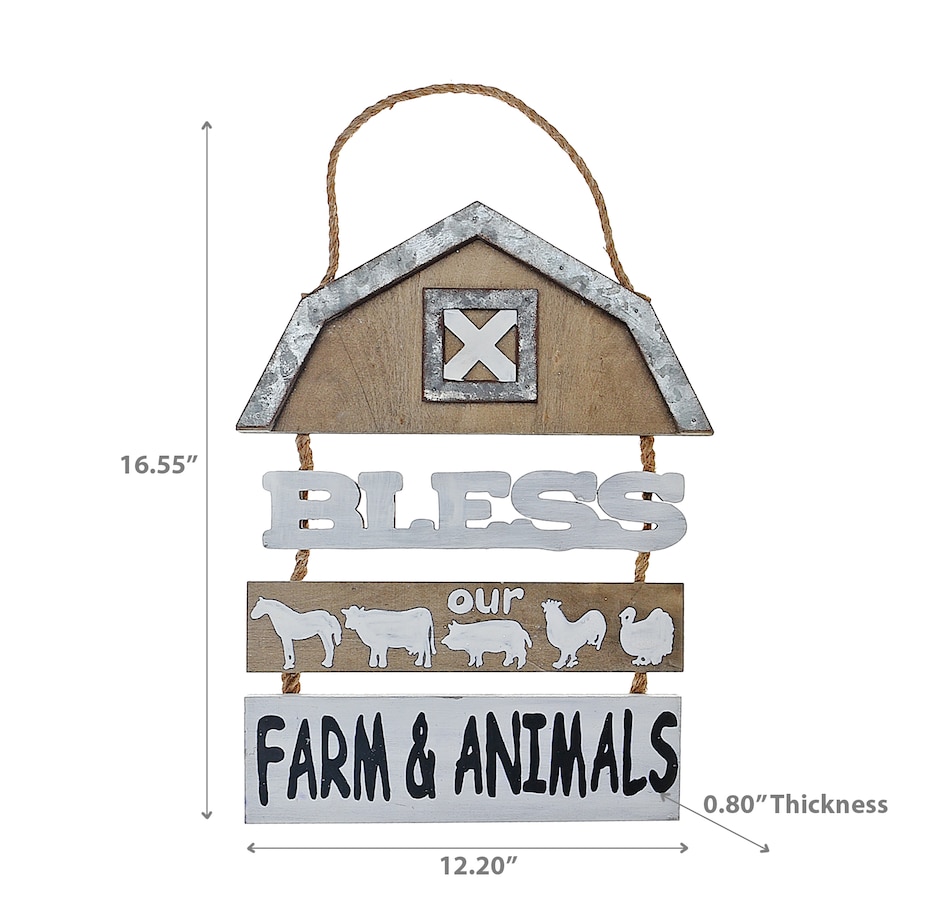This decorative hanger is a perfect addition to any farmhouse-style décor. Crafted from wood and painted white, the hanger features the phrase "Bless Our Farm & Animals". It can be hung in your mudroom, kitchen, or living room as a reminder to be thankful for all that your farm and animals provide. This wall decor is the perfect gift for any special occasion, such as a housewarming, birthday, or holiday. Design: Bless Our Farm & Animals Hanger Material: Wood Dimension: 12.20 L × 0.80 W × 16.55 H inches Use: Ideal for Room Care Tip: Spot Clean