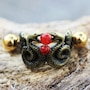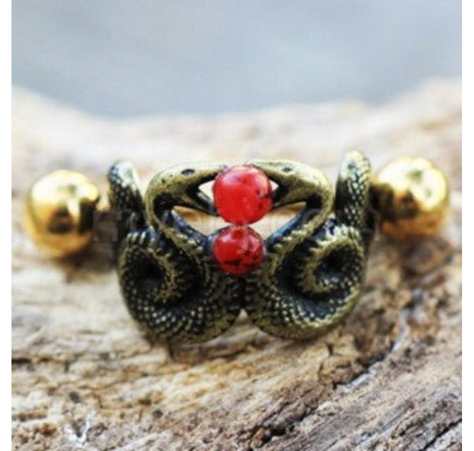 Cartilage Cuff Earring with Snake Design‚Yellow Gold Plated Barbell‚Antique Yellow Gold Plated Cuff with Black accent‚Two Red Plastic Beads‚Barbell Thickness : 16GA | 1.2mm‚Barbell Length : 1/2" | 12.5mm‚Cuff Size : 12 x 9mm‚Material : Gold Plated 316L Stainless Steel, Gold Plated Zinc Alloy, Plastic Bead