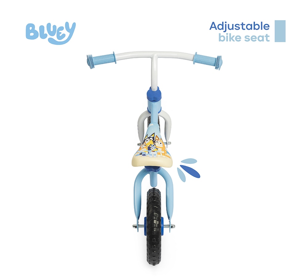 The Bluey Balance Bike makes it easy for your child to learn to ride—they'll sit on the seat and push off and learn to balance and steer. With 10-inch puncture-proof EVA wheels, comfortable handlebar grips perfect for little hands and an adjustable seat, this Bluey bike is perfect for toddlers or kids ages 18 months to 3 years. Your child can learn to ride with Bluey!