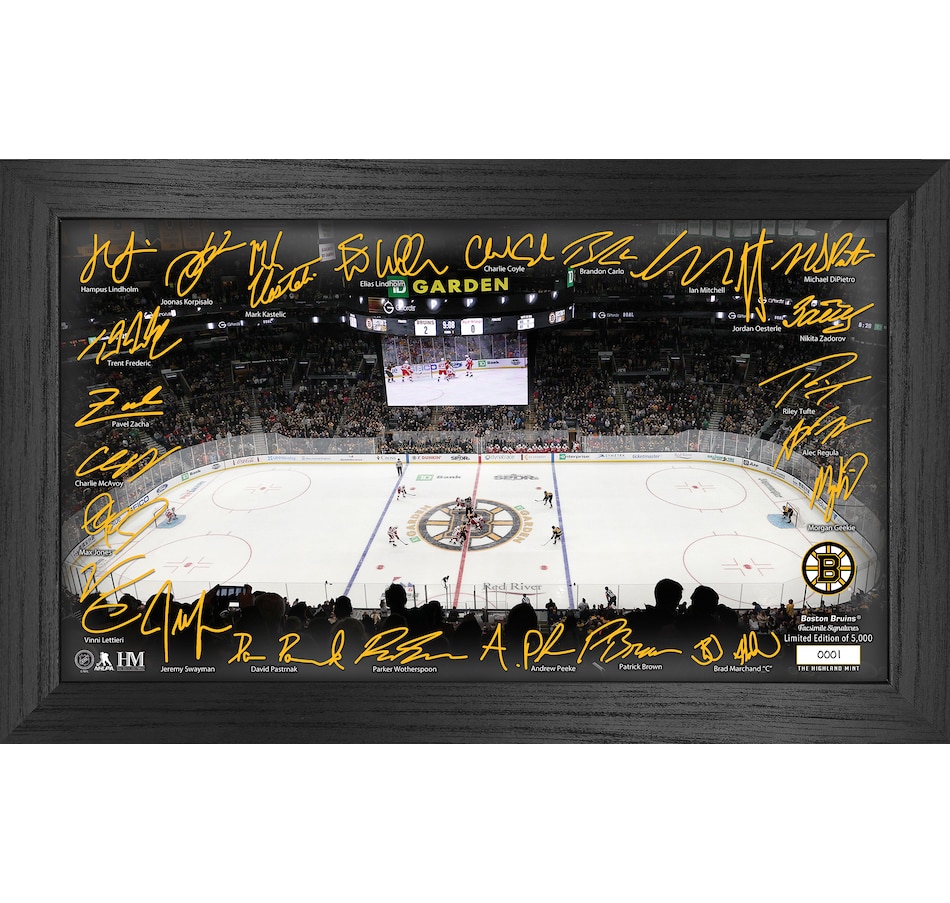 This 2024–25 Season Signature Rink features the facsimile signatures of the Boston Bruins roster around their home rink. Each print is individually hand-numbered and delivered in a 12" x 20" wooden frame with an acrylic glass front panel.