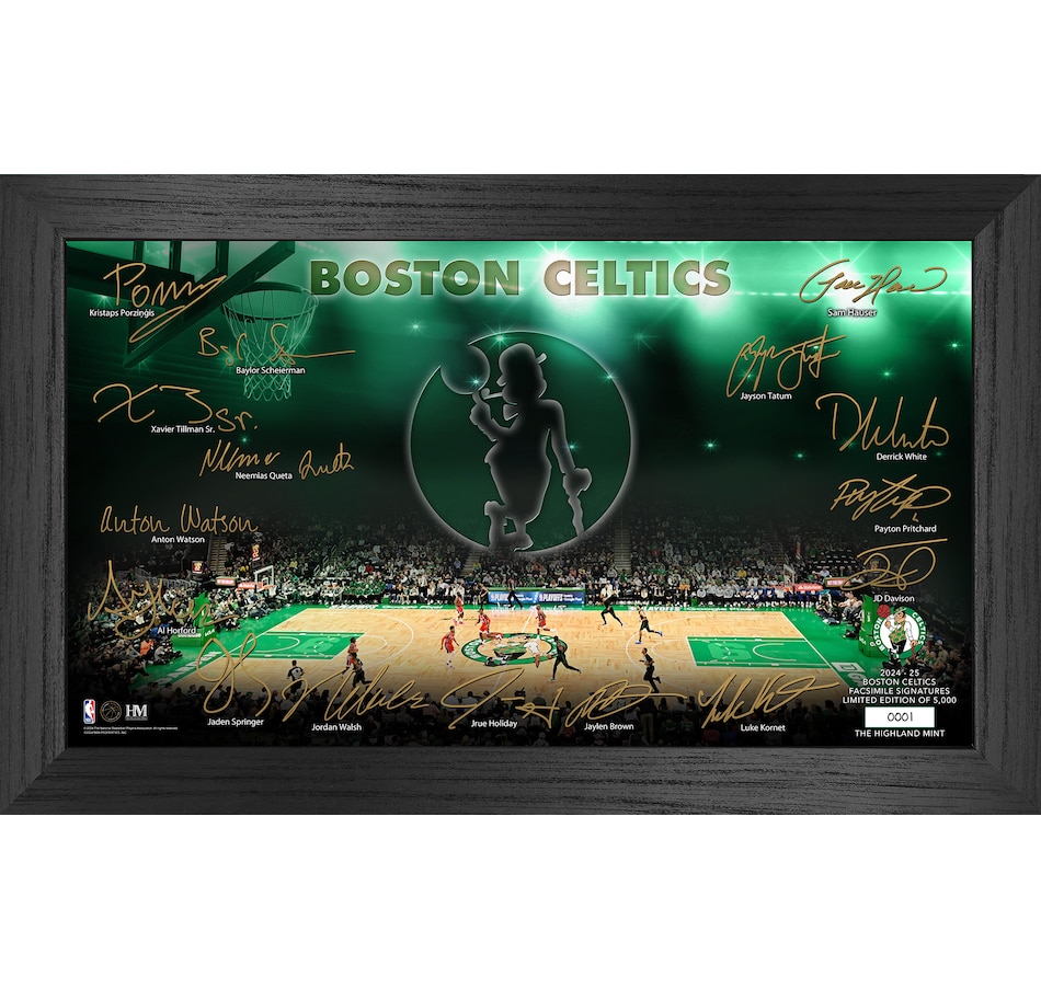 This Signature Court print features facsimile signatures of the Boston Celtics roster displayed around their home court. Each print is hand-numbered and comes in a 12" x 20" wooden frame with an acrylic glass front panel.