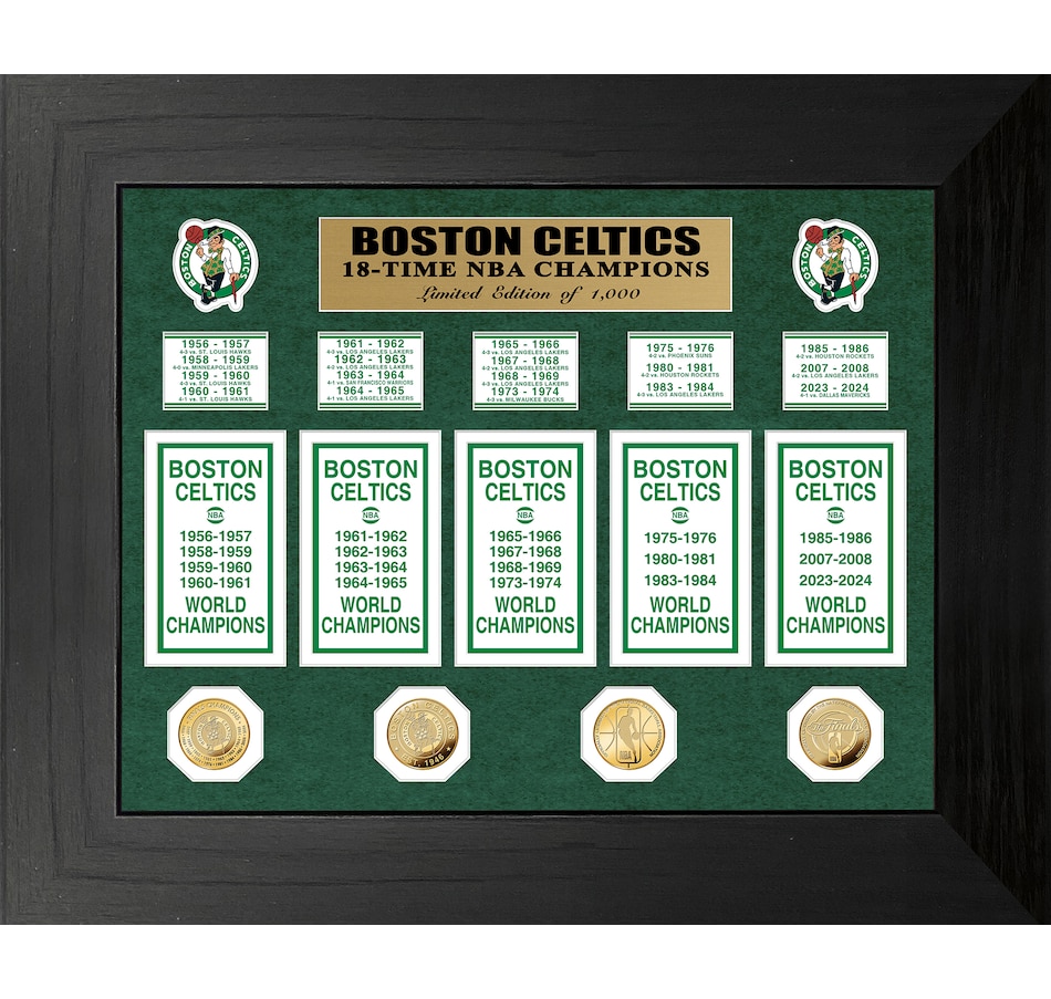 This deluxe championship banner collection commemorates the record 18 NBA Championships won by the Boston Celtics. Featured in a black 18" x 22" wood frame with 2.5" wide molding and suede double matting, under a protective acrylic glass panel, are commemorative championship banners with years listed on each. Included under the banners are four gold plated 39mm in diameter minted commemorative coins: Boston Celtics 18-time champions coin, Boston Celtics franchise coin, official NBA coin, and the NBA finals coin. An engraved nameplate is matted above the banner. Available in a limited edition of only 1000 and officially licensed by the NBA, a certificate of authenticity accompanies each collectible frame. This product is proudly made in the USA by The Highland Mint!