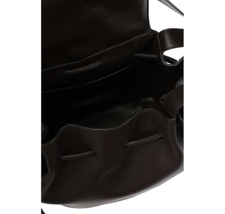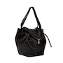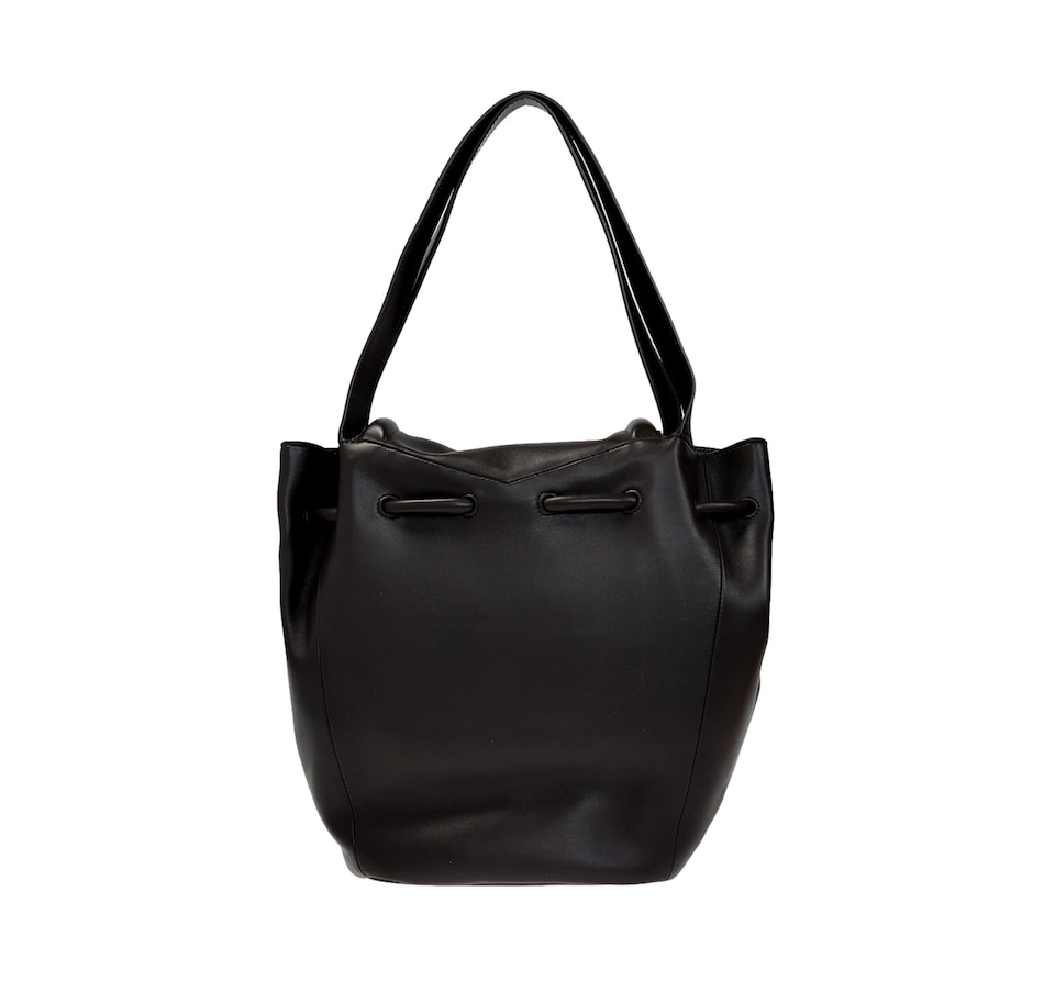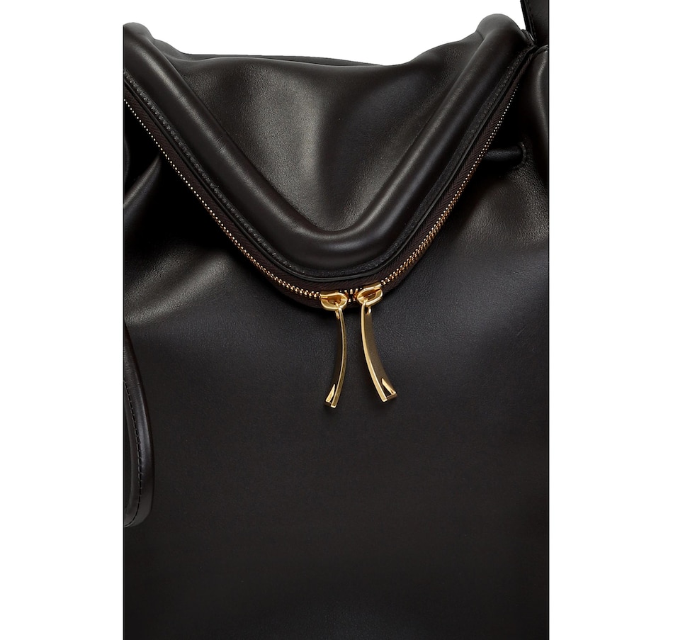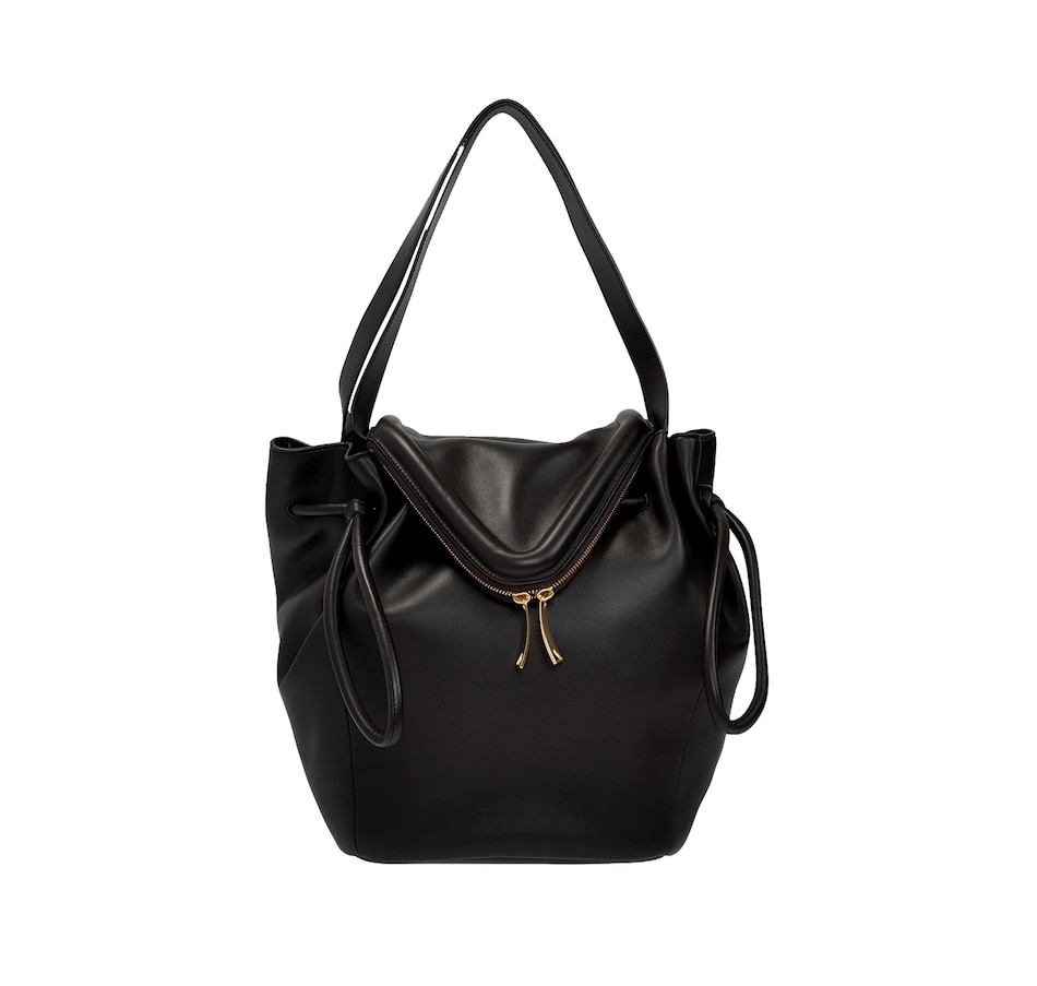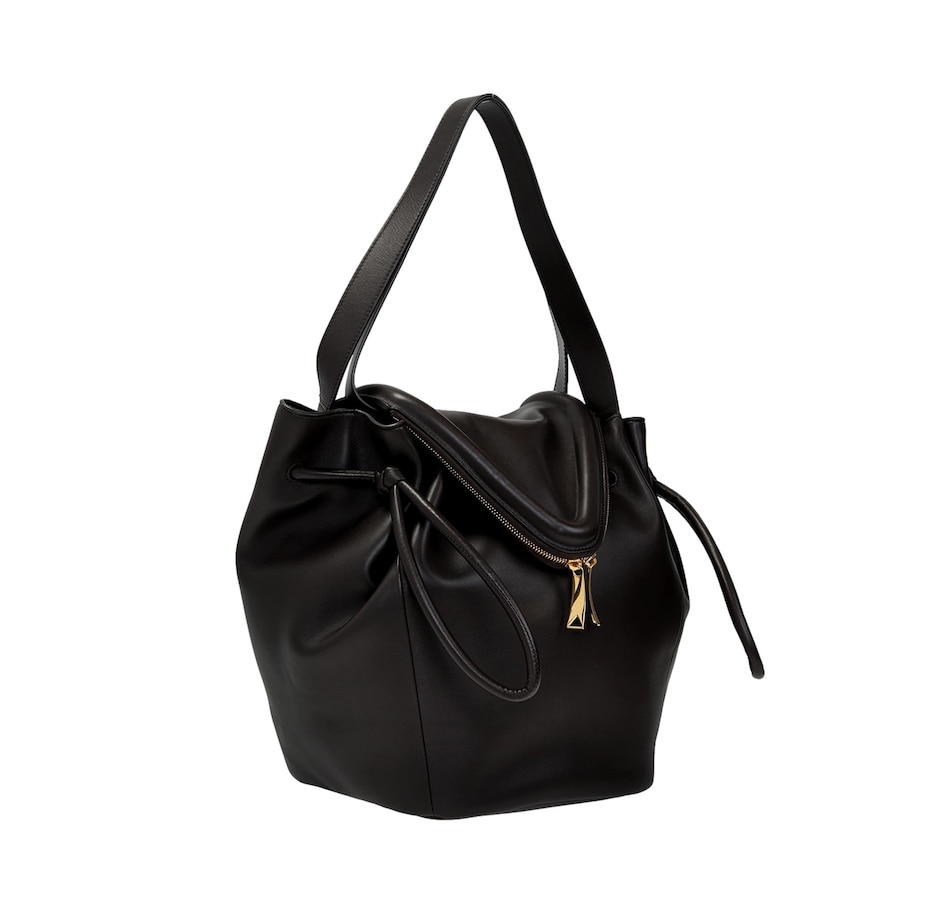 This Large Black Bottega Veneta Beak Shoulder Bag continues to seamlessly combine luxury and simplicity. The perfect combination from the prestigious fashion brand Bottega Veneta. Clean shapes, geometric lines, and a few iconic details have become symbols of the aesthetic class of one of the best Italian excellences in the world. This Large Beak Handbag in the color nero is crafted in supple calfskin leather. This gorgeous black leather handbag is the perfect every day bag to carry what you need day in and day out.  The design a bucket style with drawstring closure as well as top handles and a shoulder strap.  Model: 666531 Color: Black 100% Nappa Calfskin Leather Double Top Handles Drawstring closure Front V Flap with Zip Closure Leather interior One Interior Pocket Measures: 12"L x 13"H x 8"D  Shoulder strap drop: 8" Authenticity cards and dust cover included Made in Italy
