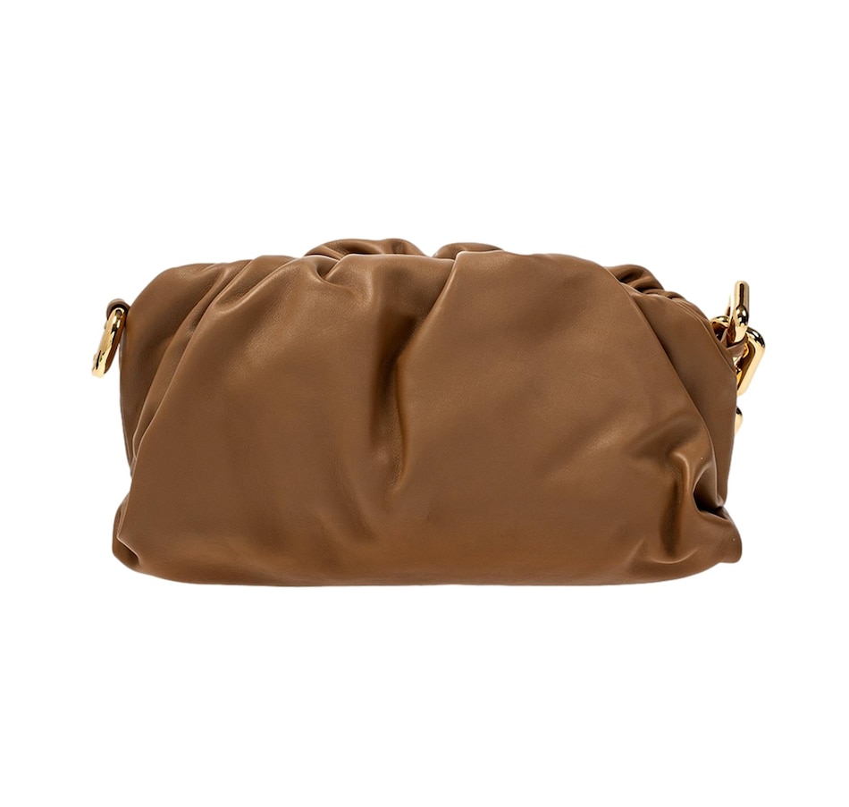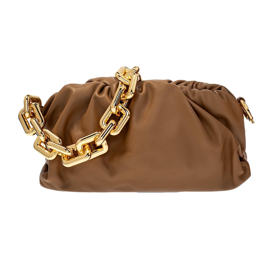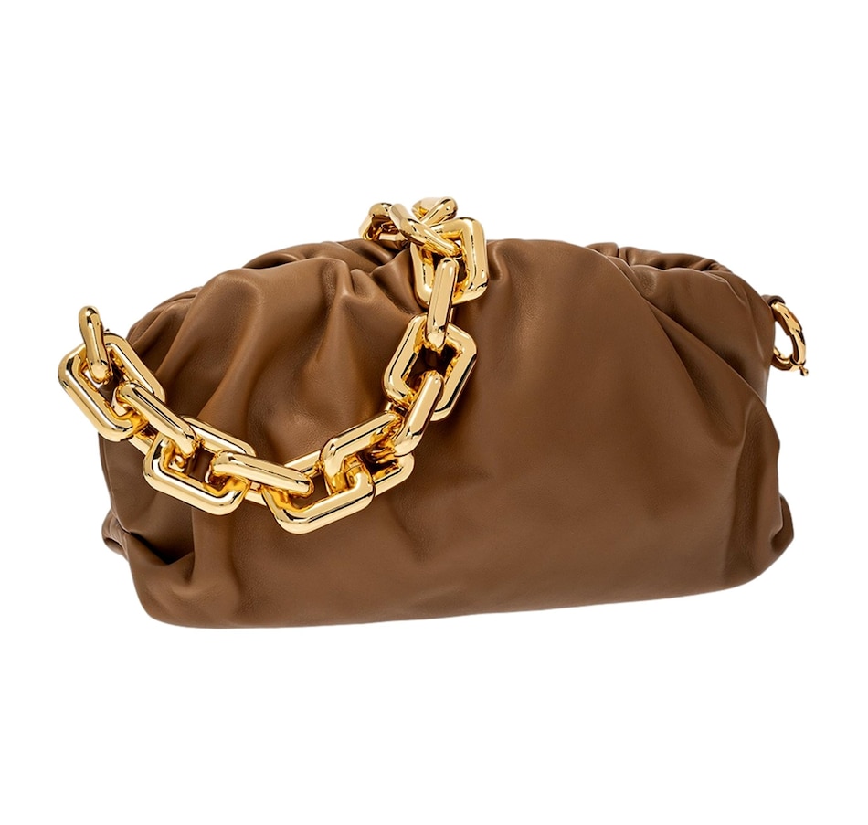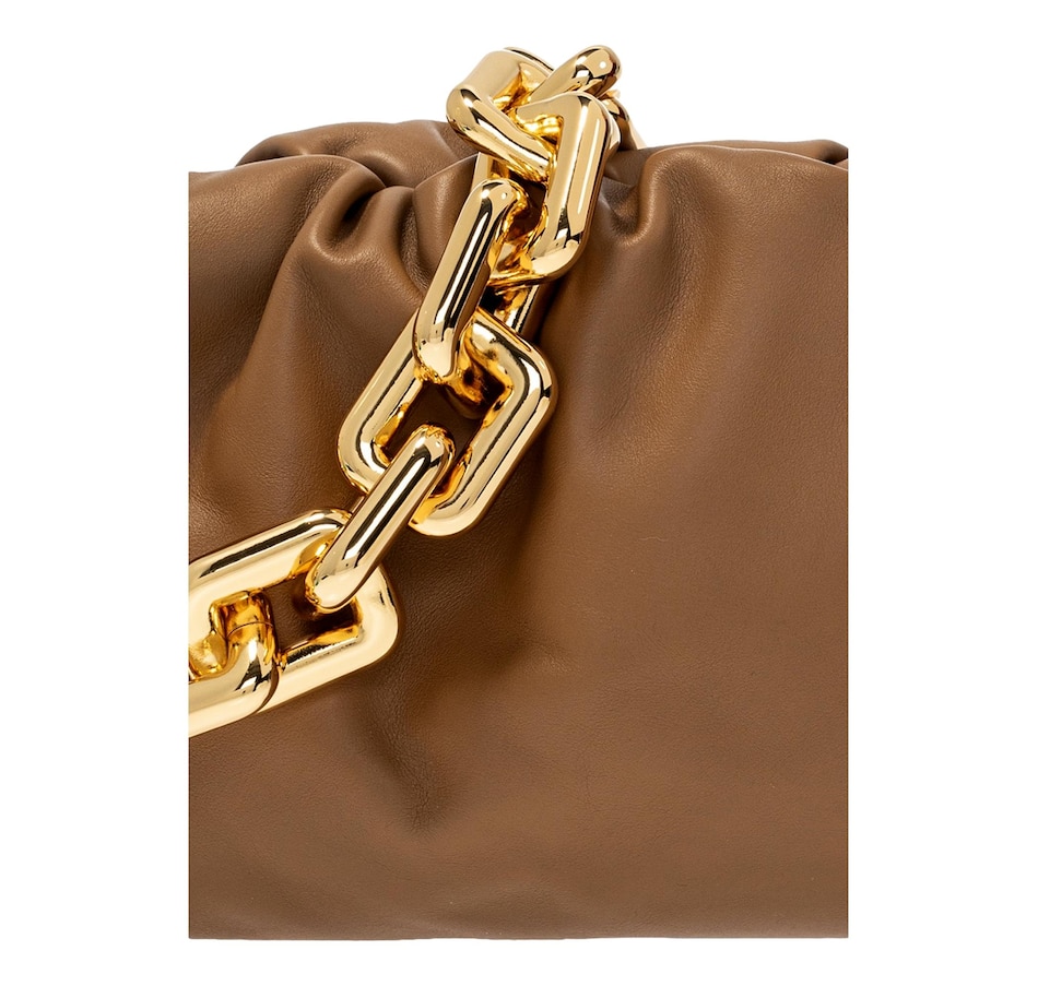 Show up in style with The Chain Pouch from Bottega Veneta. This bag features a beautiful gold-tone chain strap and is crafted from supple brown calfskin leather. Featuring a spacious leather-lined interior, this shoulder bag is perfect for carrying the essentials. The luxurious silhouette and signature craftsmanship from Bottega Veneta makes an unforgettable fashion statement.