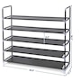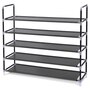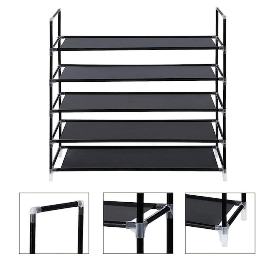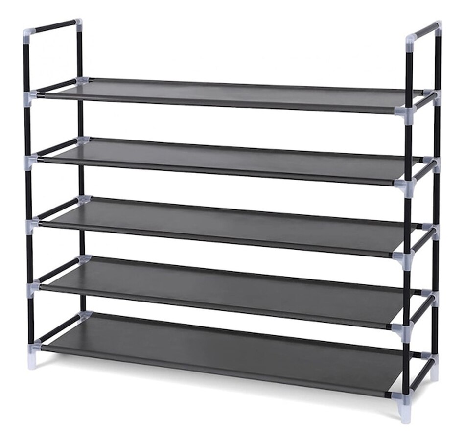 Are all of the family’s shoes piling up in the hallway? Instead of tucking them haphazardly in the corner, accommodate them in this smart five-tier shoe rack. Say goodbye to flimsy shoe storage—this shoe rack is crafted with heavy-duty metal pipes (16-mm diameter) and waterproof fabric, ensureing high quality for long-term use. With a 6.7-inch distance between each tier, the rack can hold 20 to 25 pairs of various kinds of shoes; for taller heels or boots, simply remove one shelf to open up the space. This shoe rack makes a nice addition to your closet, hallway, entryway, bedroom or utility room. It looks attractive and helps keep your stray sneakers and flip-flops neatly organized. Numbered parts and illustrated instructions a;sp make for an easy assembly process.