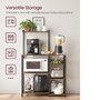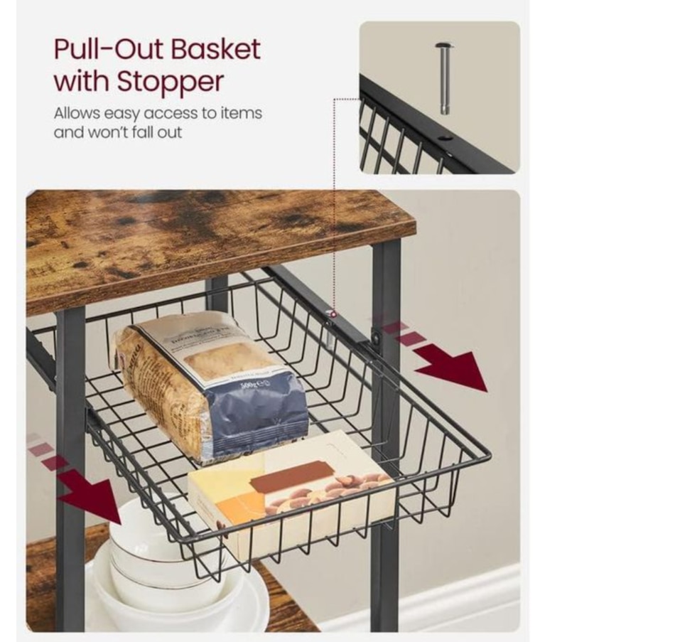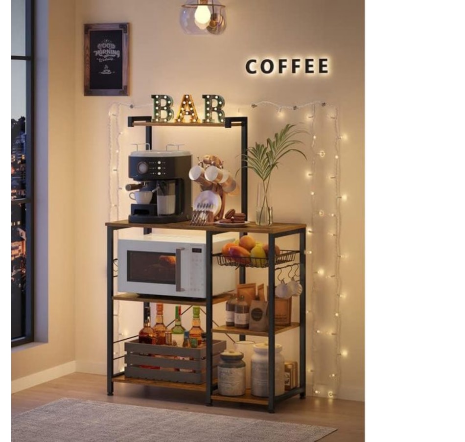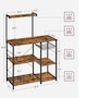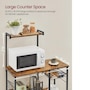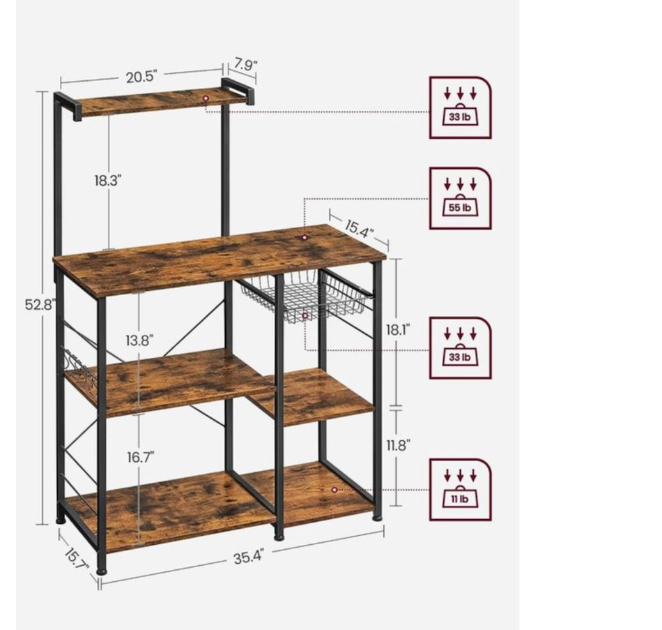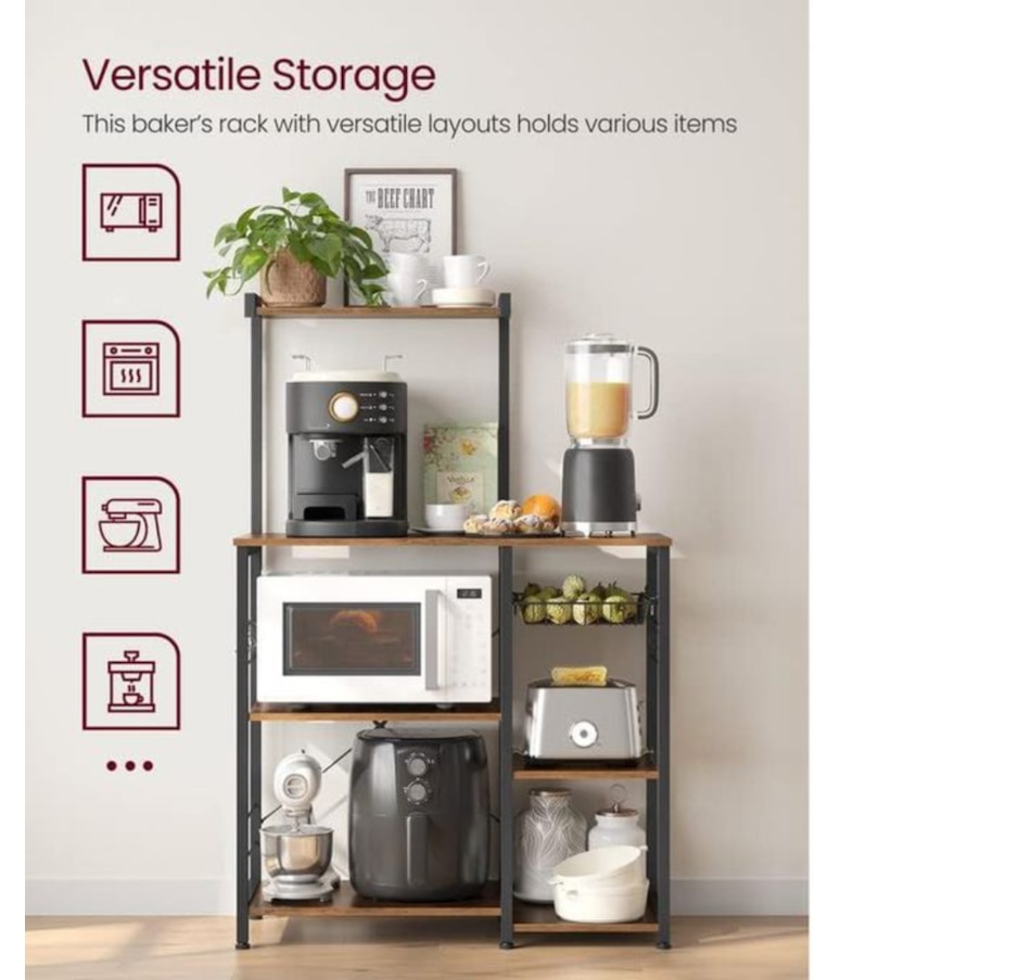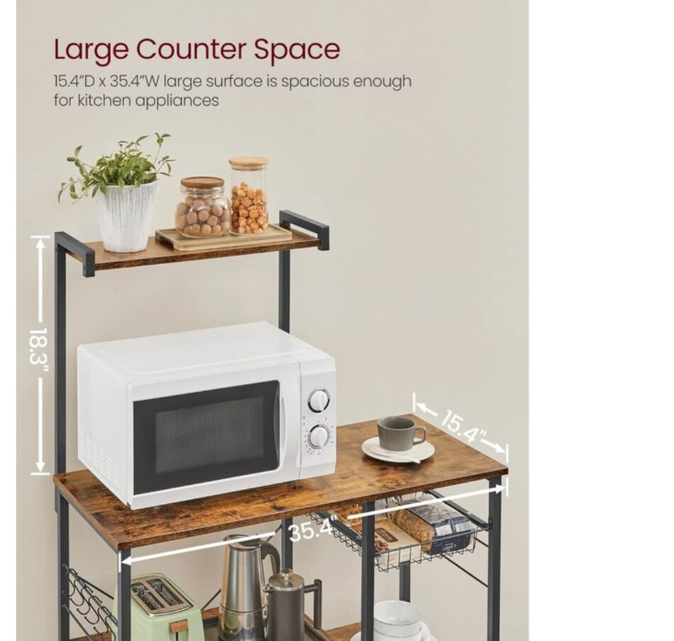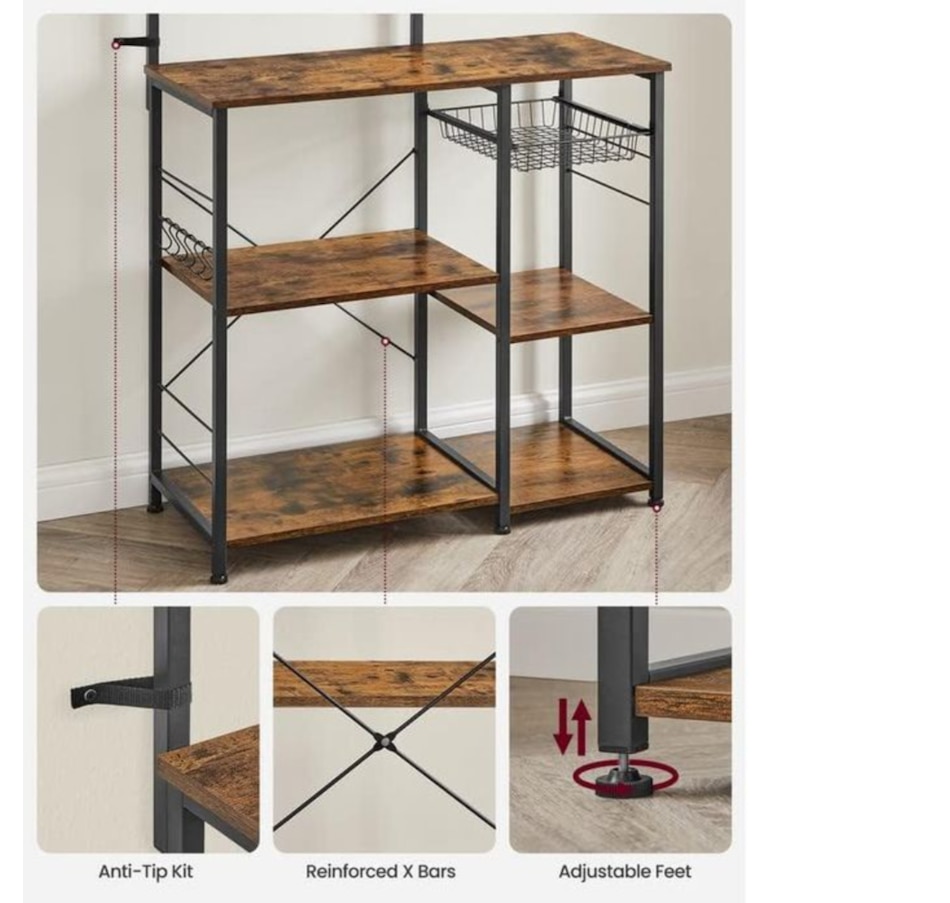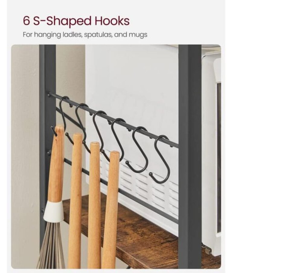 Running out of pantry space? Let this versatile baker's rack come to the rescue. Boasting abundant shelving, six S-hooks, and a wire basket, it offers room for everything from food prep essentials and cookware to drinks, spices, and more. Crafted from durable particleboard and a sturdy metal frame with 20mm x 20mm tubes, this microwave stand ensures the support your kitchen needs, with adjustable feet to maintain stability even on uneven floors. And thanks to numbered parts and easy-to-follow instructions, you can have it set up in 30 minutes or less, just in time for your freshly baked pizza! Plus, if you're seeking an affordable style upgrade for your kitchen, the rustic brown and matte black design of this baker's rack offers the perfect solution for adding charm without breaking the bank.