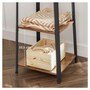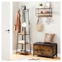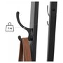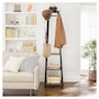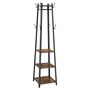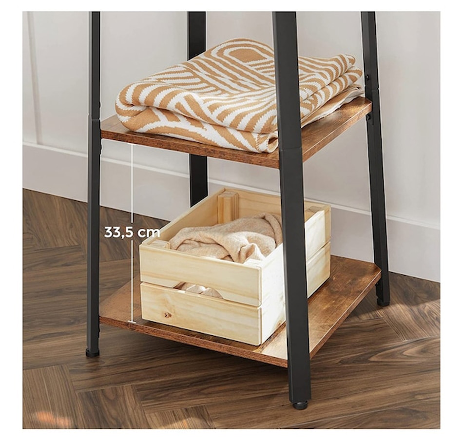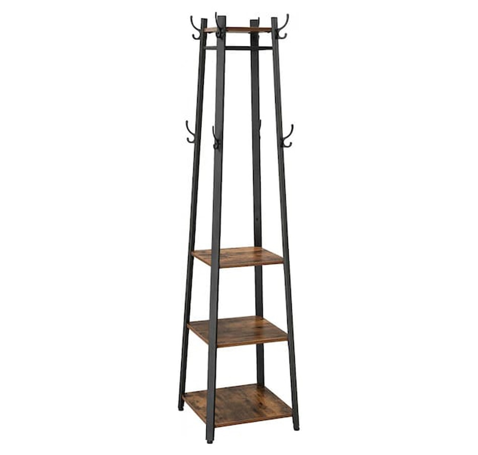 This stylish coat rack brings an industrial touch to your entrance, and simultaneously creates enough storage for jackets, coats, caps and bags. With the sides tapering slightly towards the top, the matte-black steel frame gives this coat rack more than just a unique shape—it also provides stability and firmly supports the three shelves. The storage basket goes on the shelves, the hats go on the top hooks, and the hangers go on the hanging rods, but the lower hooks are also perfect for kids to hang up their coats and bags from school. Thanks to its space-saving design, this coat rack fits perfectly into even a small hallway while also cutting a fine figure in the corner of the living room.