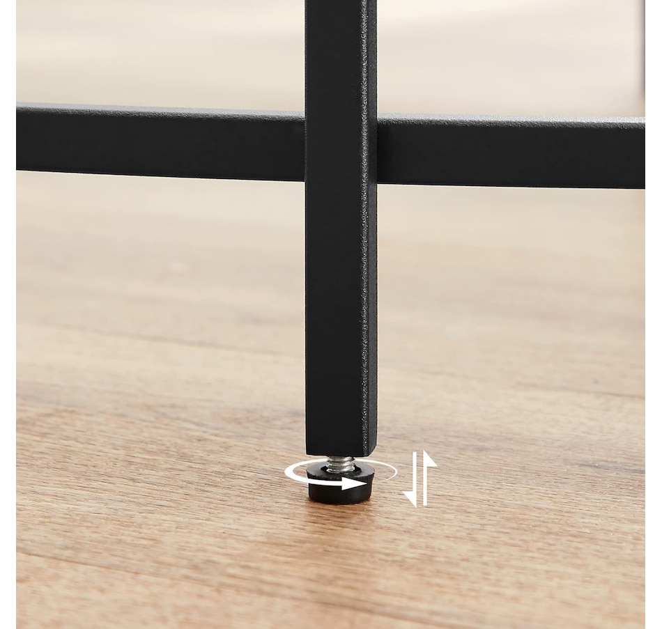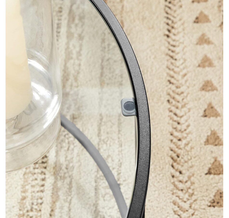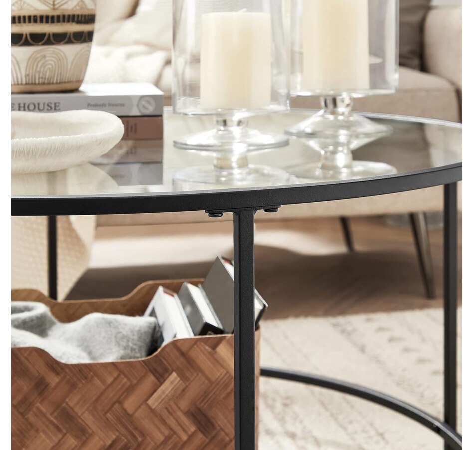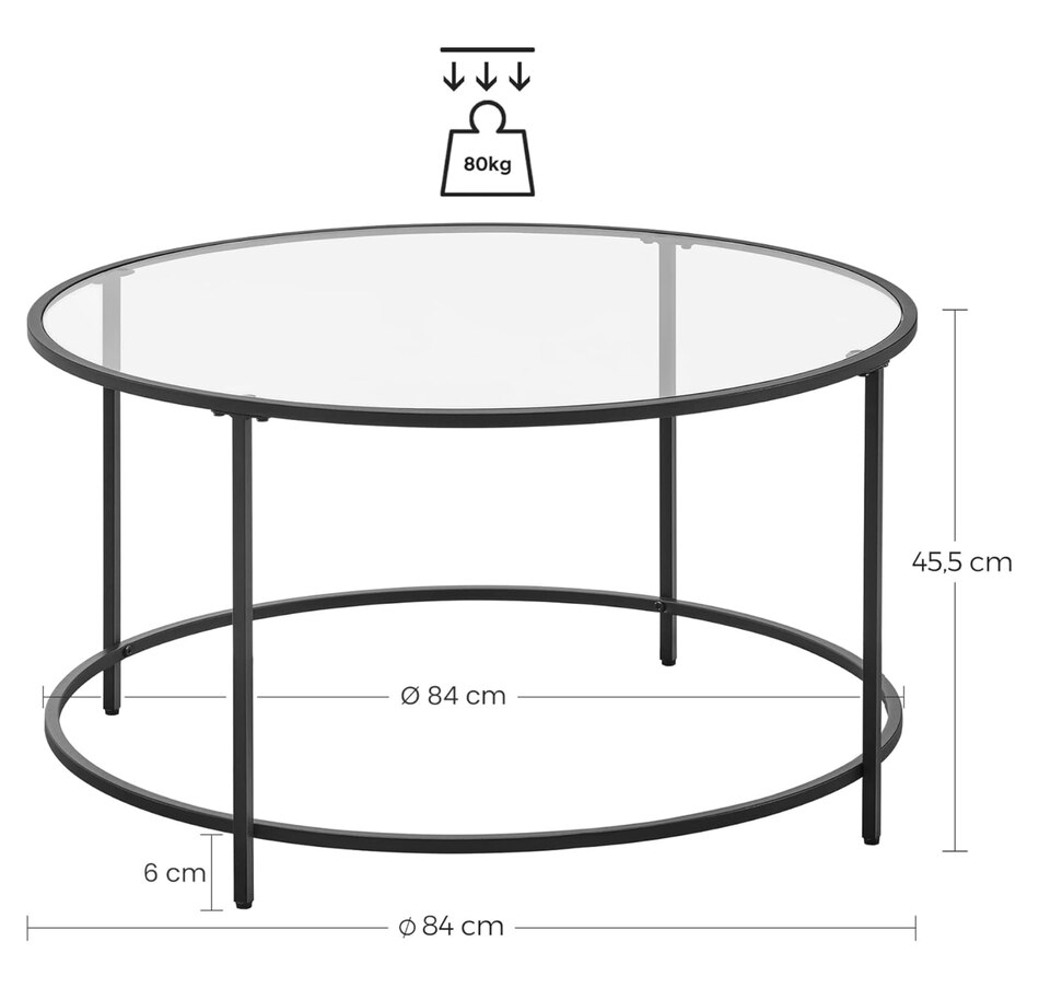 Elevate your interior decor with a touch of sophistication and flair by showcasing your style with this striking coffee table. Its black metal frame and transparent glass top combine to create a captivating fusion of chic aesthetics that exudes both class and individuality. A durable yet delicate accent for your home, this coffee table has two rings, and four steel legs that form its solid foundation. The table's surface is crafted from 6mm tempered glass, making for exceptional durability and strength, confidently holding up to 70 kg and offering versatility for various uses. Its adjustable feet are designed to accommodate both carpeted and parquet flooring while protecting your surfaces from unsightly scratches. For those who value simplicity, assembly is a breeze, with a straightforward structure and clearly labeled individual parts, accompanied by easy-to-understand assembly instructions. This coffee table not only makes a statement but also delivers on both durability and user-friendliness, creating a striking focal point for your living space.