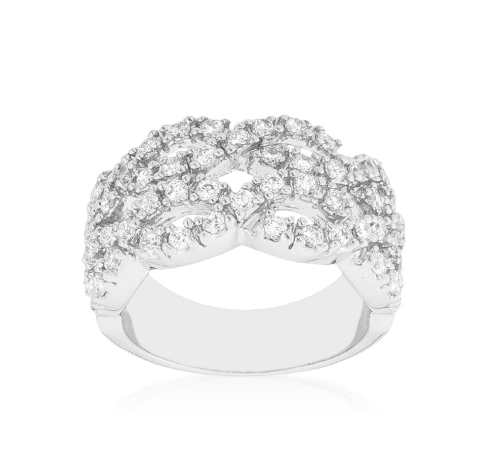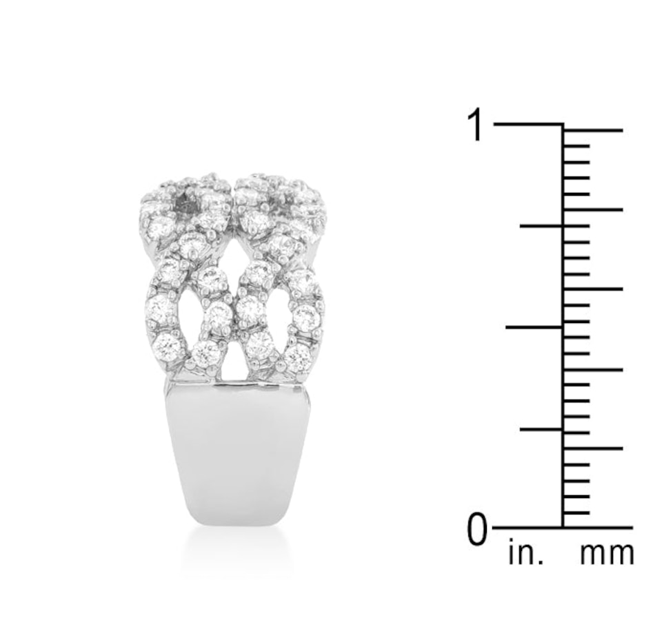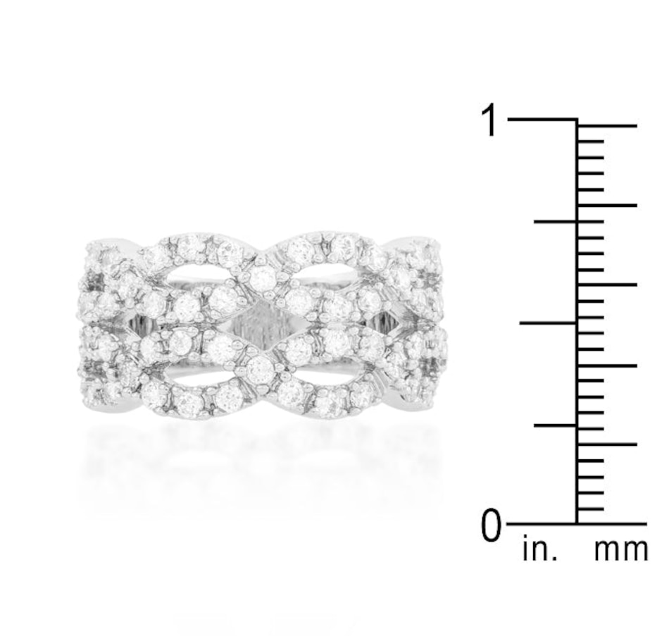 Fashioned in a versatile braided design this cocktail ring is perfect for any occasion. Our genuine finish is achieved using an electroplating process that coats the item with heavy layers of a close cousin to platinum which gives our jewelry a platinum luster.