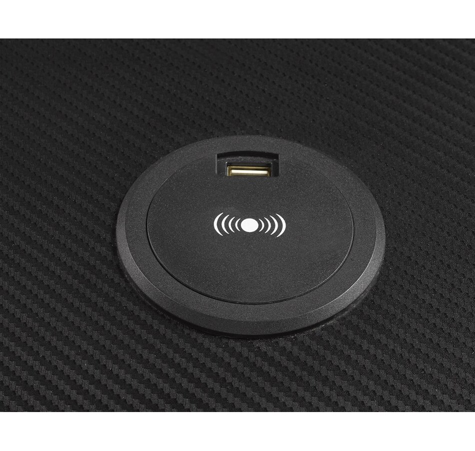 The table features multi-level LED lighting with touch controls to allow for the most optimal gaming experience, while the built-in headset and cup holders keep your playing essentials easily within reach for those long online gaming marathons! Integrated wireless and USB charging stations keep you connected at all times. The contemporary frame features a powder-coated iron tube for long-lasting use, while the carbon-fibre-inspired top adds a sophisticated touch to the professional design.